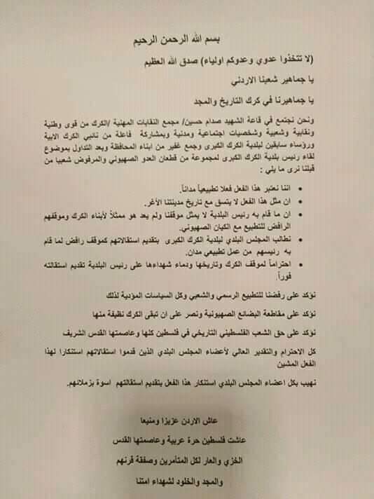 وطالب الحضور ومن خلال البيان الصادر اعضاء المجلس البلدي لبلدية الكرك الكبرى بتقديم استقالاتهم كموقف رافض لما قام به رئيسهم من عمل تطبيعي مدان .. اضافة الى مطالبتهم بضرورة تقدم رئيس البلدية باستقالته احتراماً لموقف الكرك وتاريخها ودماء شهداءها .