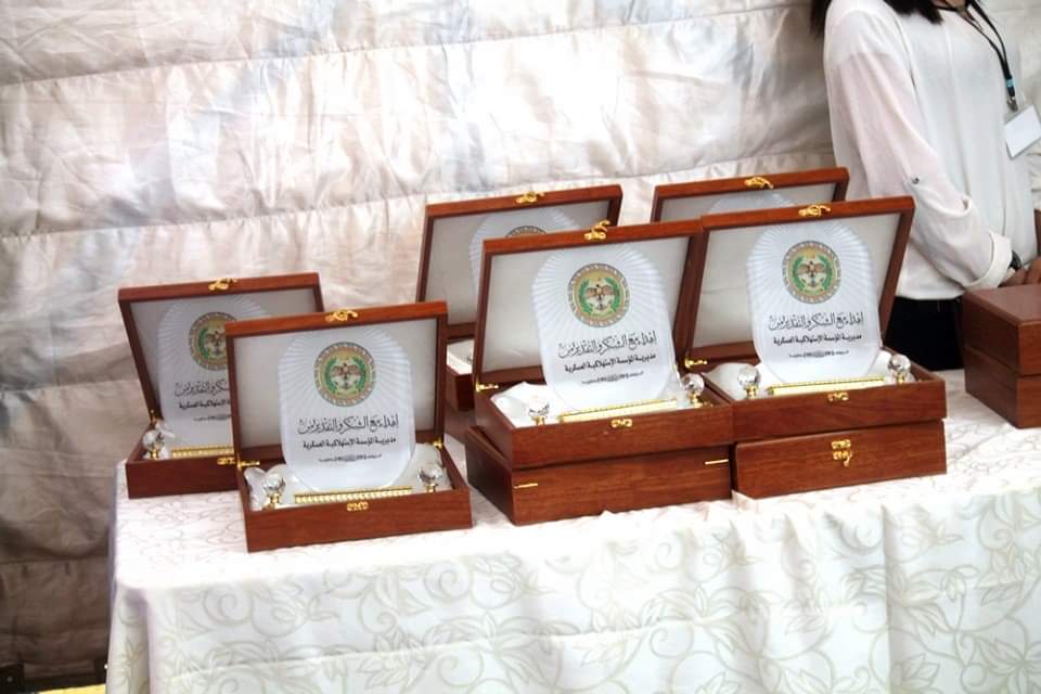 وفي نهاية حفل افتتاح المهرجان، قدم راعي الحفل الدروع للشركات الراعية والشركات المشاركة في المهرجان وجال الحضور لمشاهدة المنتجات المعروضة
