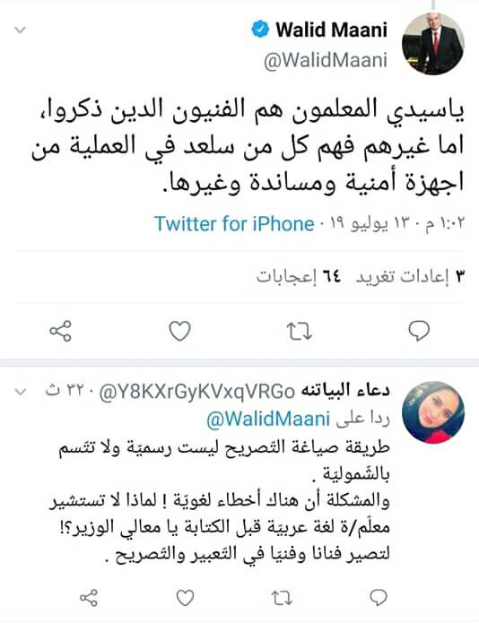 الدكتورة دعاء وصفي البياتنة والتي تحمل شهادة الدكتوراة في تخصص النقد وآداب الحديث ردت على التغريدة بانتقاد يكاد يتحدث عما بداخل كل من قرأ التغريدة حيث كتبت : "طريقة صياغة التصريح ليست رسمية ولا تتسم بالشمولية . والمشكلة ان هناك اخطاء لغوية ! لماذا لا تستشير معلم/ة لغة عربية قبل الكتابة يا معالي الوزير ؟! لتصير فنانا وفنيا في التعبير والتصريح" .