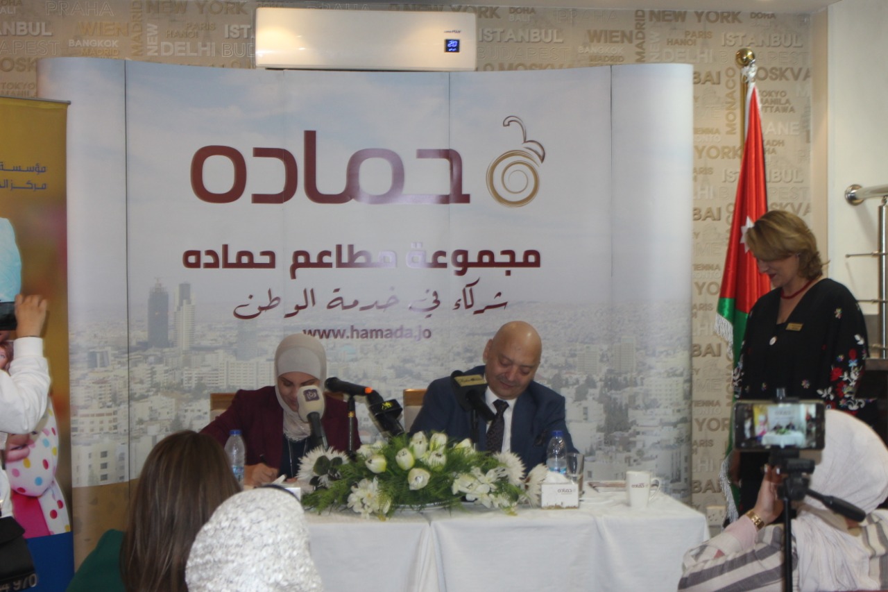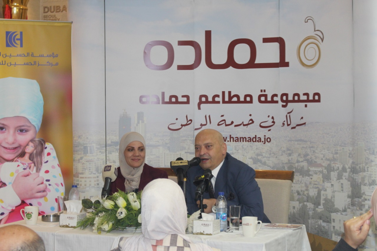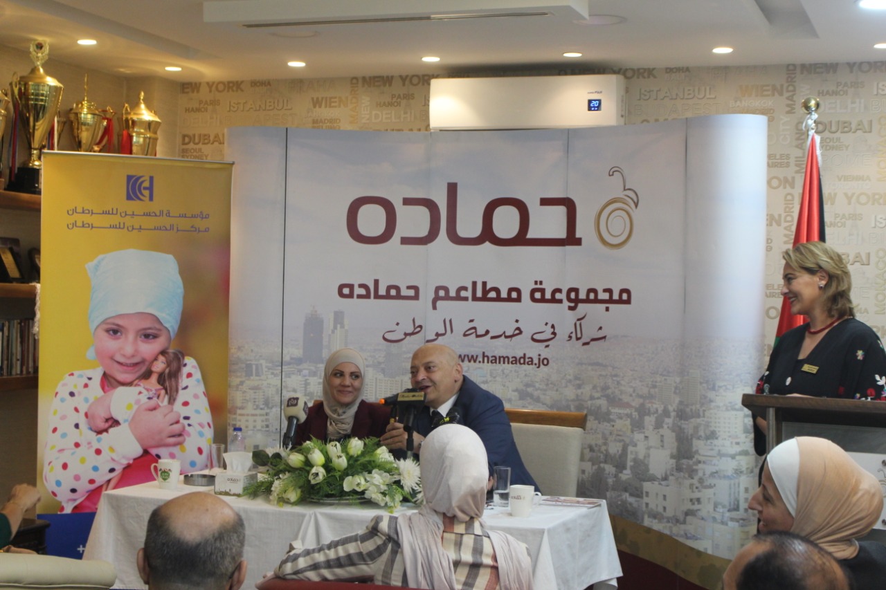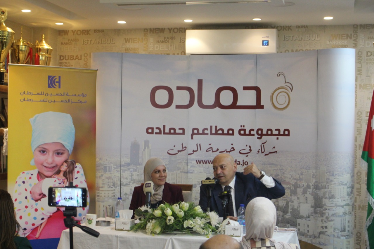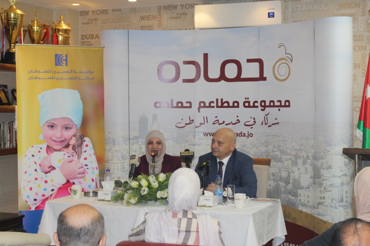 عمان، 22 تشرين الأول 2019 - وقّعت مؤسّسة الحسين للسرطان مذكرة تفاهم مع مطاعم حماده، تقوم بموجبها بتقديم الدعم لعدد من برامجها وحملاتها، جاء ذلك ضمن فعاليات المؤتمر الصحفي الذي تم عقده في الصالون الثقافي في نادي حماده، حيث وقع الاتفاقية السيدة نسرين قطامش، مدير عام مؤسسة الحسين للسرطان، والسيد رائد حماده، رئيس مجلس إدارة مجموعة مطاعم حماده.