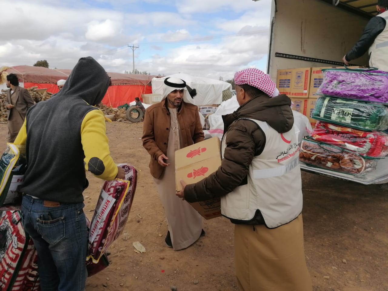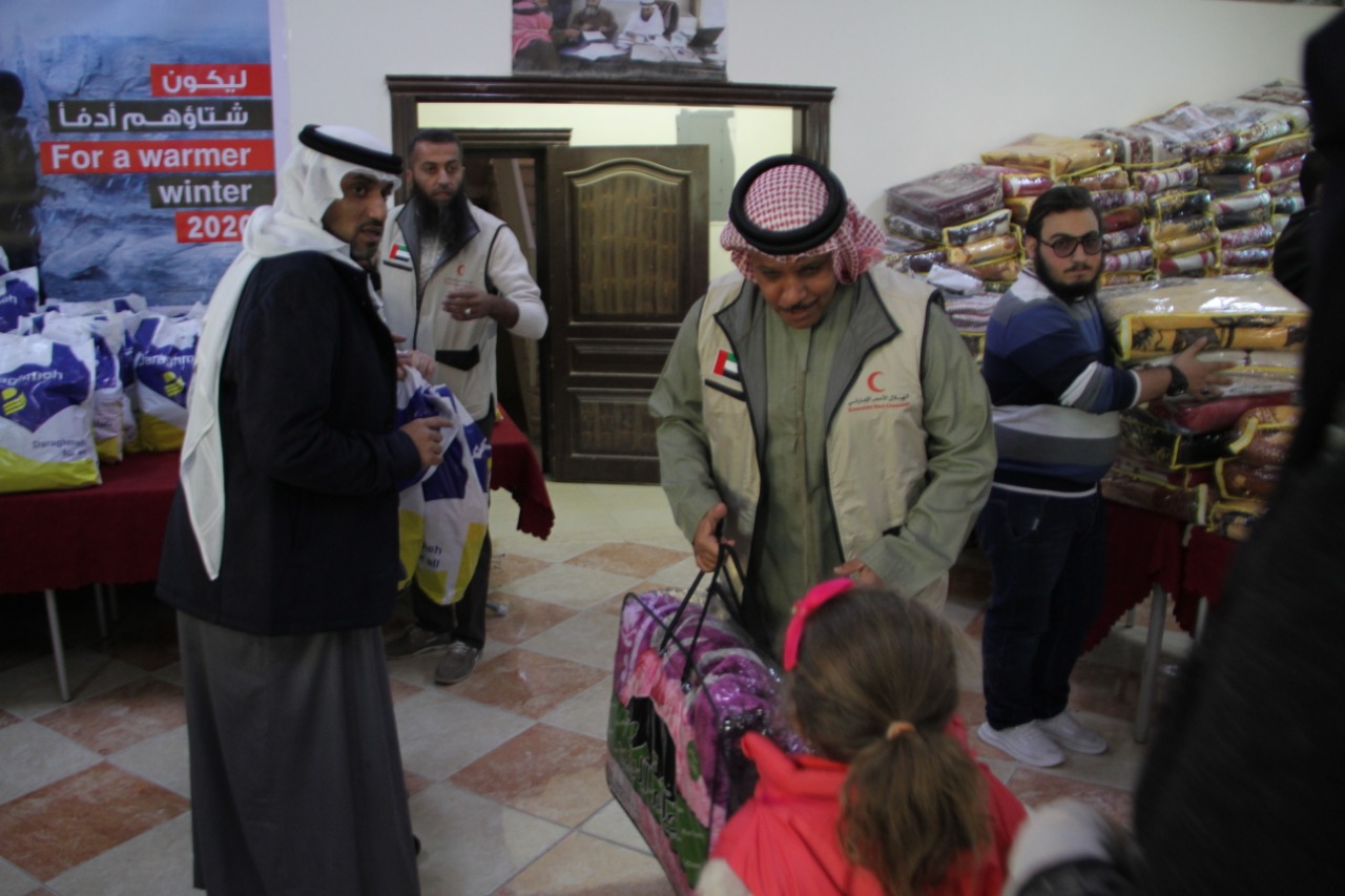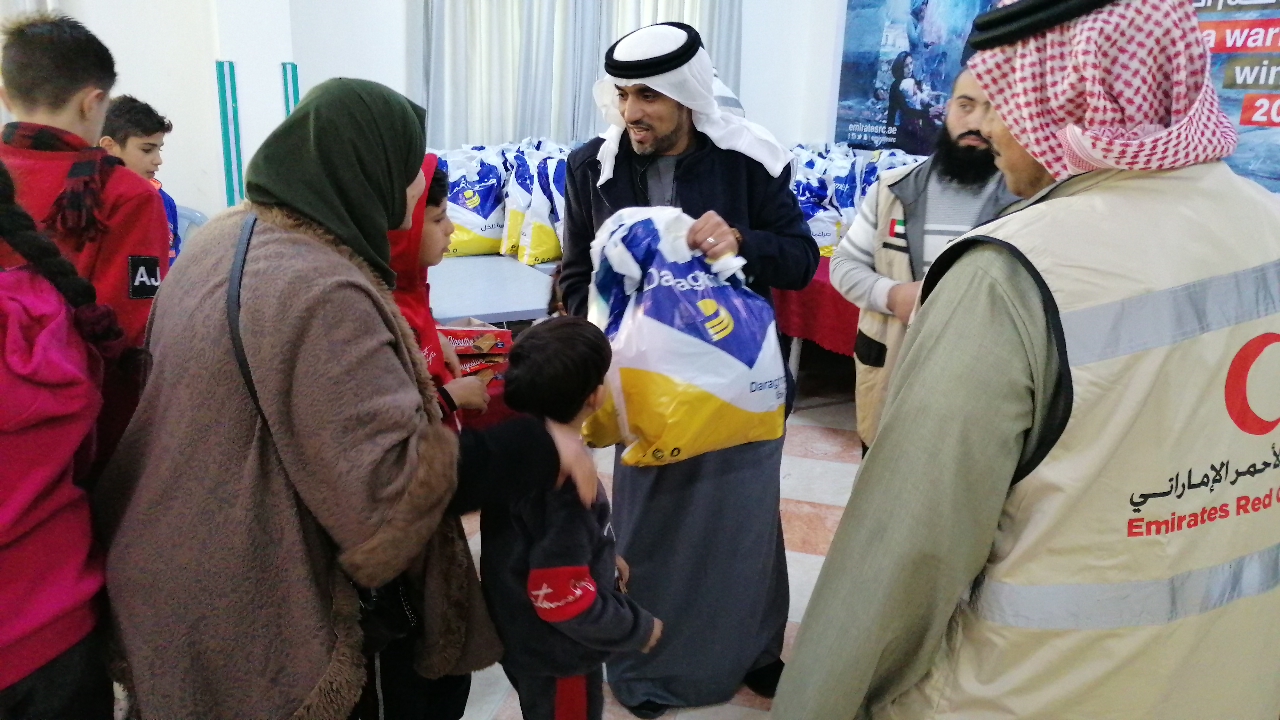 وبحضور السيد خالد علي النعيمي القائم بأعمال سفارة دولة الإمارات بالإنابة، قام وفد من هيئة الهلال الأحمر الإماراتي بتوزيع المساعدات الشتوية المكونة من مدافيء وبطّانيات وملابس ومواد غذائية، على مستحقيها من الأسر العفيفة والأيتام واللاجئين.