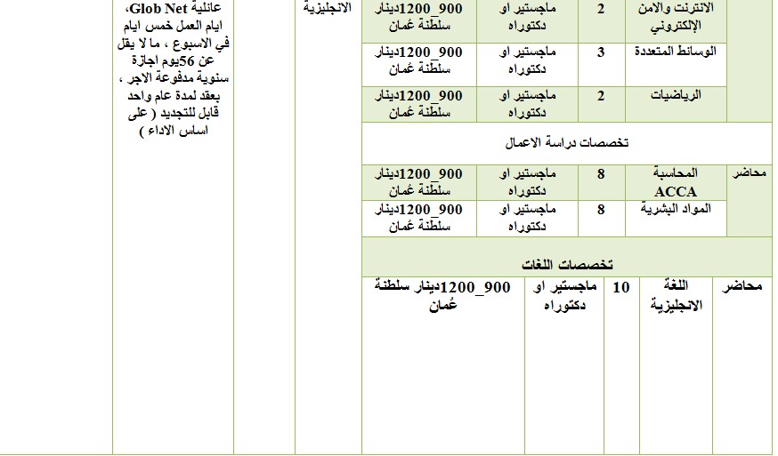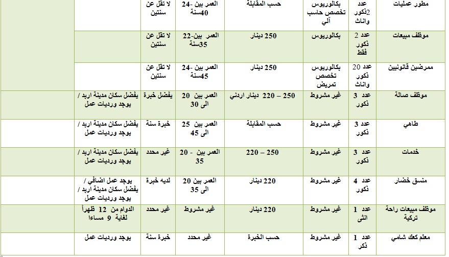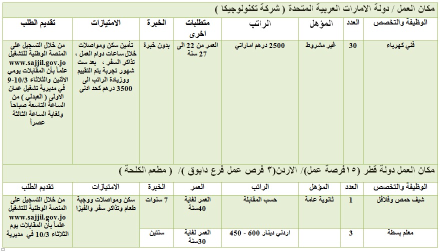 تعلن مديرية التشغيل المركزية في وزارة العمل عن توفر (198) فرصة عمل في الاردن وعدد من الدول العربية المبينة في الجدول ادناه، موزعين كالتالي : سلطنة عُمان 60 فرصة عمل ، الإمارات العربية المتحدة 30 فرصة عمل، ( مطعم الكلحة) 15 فرصة عمل في قطر و3 فرص في الاردن_ فرع دابوق، 57 فرصة عمل في شركة تكنولوجيا المعلومات ومستشفى اربد التخصصي الأردن، ومطعم في اربد ، شركة ابو غزالة 33 فرصة عمل في كل من اوزبكستان، الاردن ،القاهرة ،السودان المغرب، سوريا، العراق، البحرين، قطر .