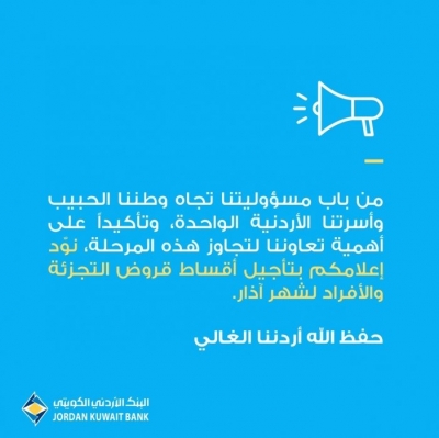 البنك الاردني الكويتي يعلن عن تأجيل استحقاق اقساط قروض التجزئة والأفراد لشهر آذار الحالي- صورة