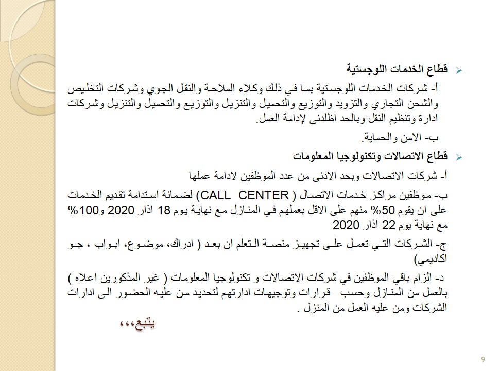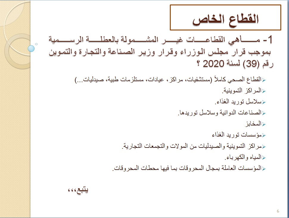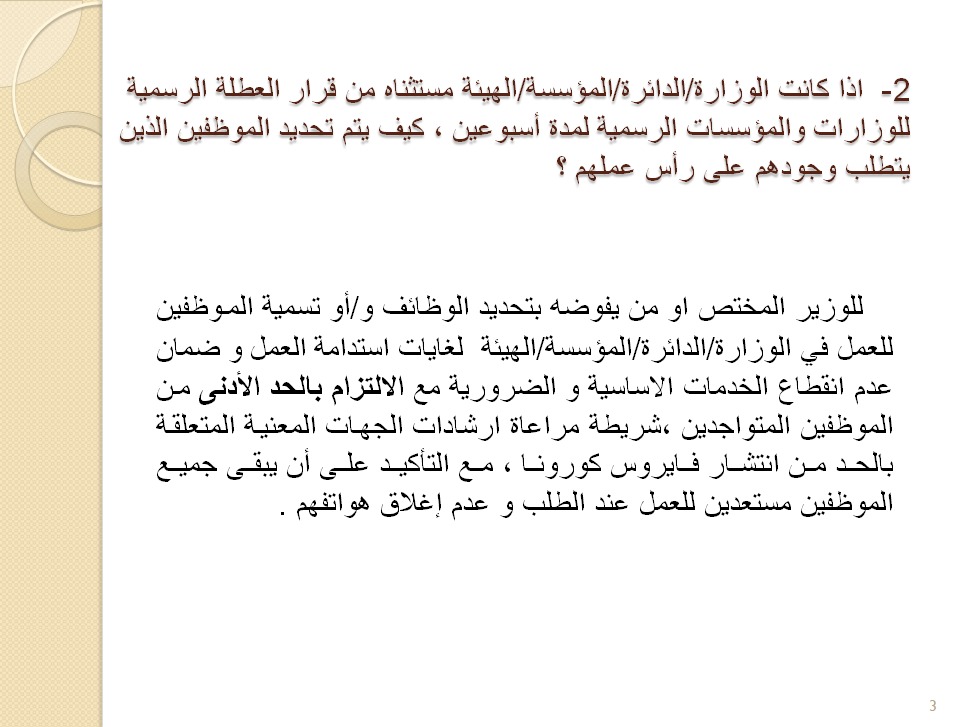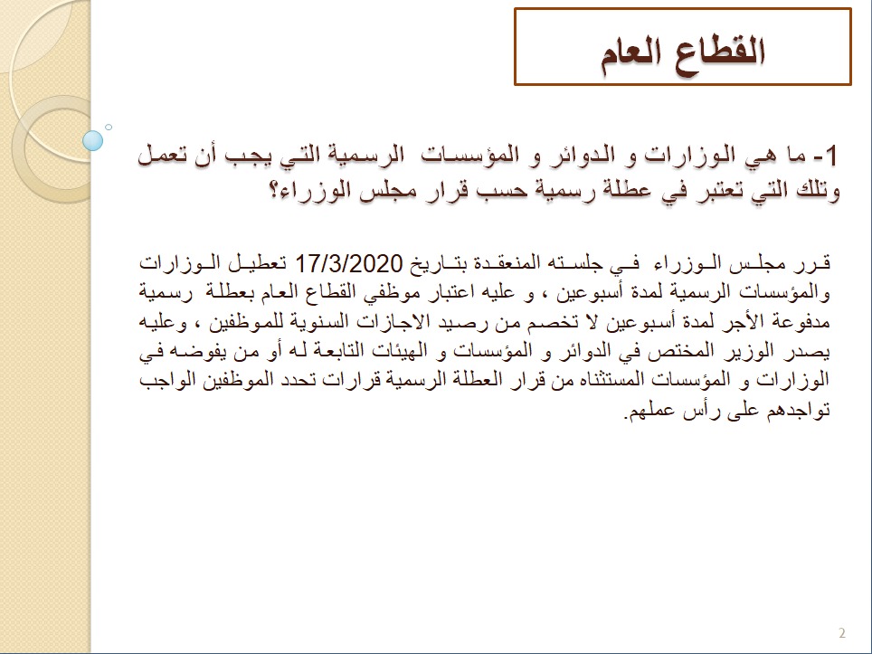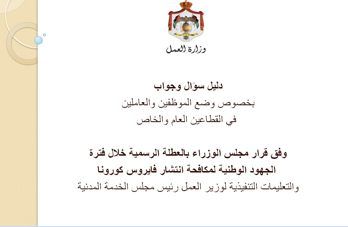 اصدرت وزارة العمل الليلة دليل سؤال وجواب بخصوص قرارات الحكومة الأخيرة ذات العلاقة بمؤسسات القطاع العام والقطاع الخاص وتعليمات وزير العمل رئيس مجلس الخدمة المدنية بخصوص حقوق وواجبات الموظفين والعاملين، خلال فترة الجهود الوطنية لمكافحة انتشار فايروس كورونا