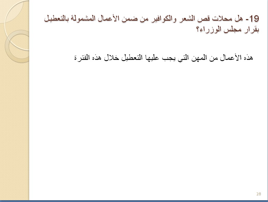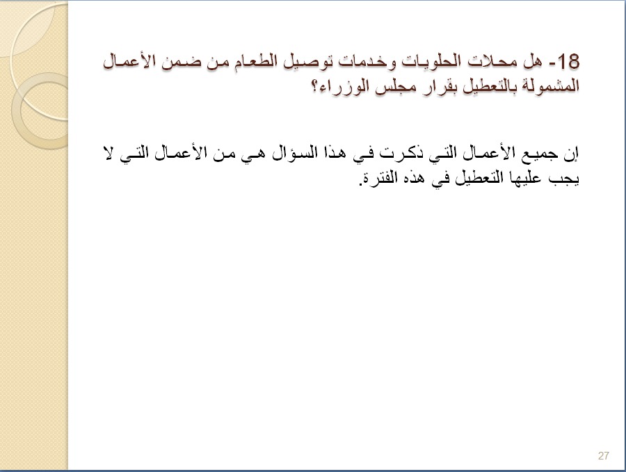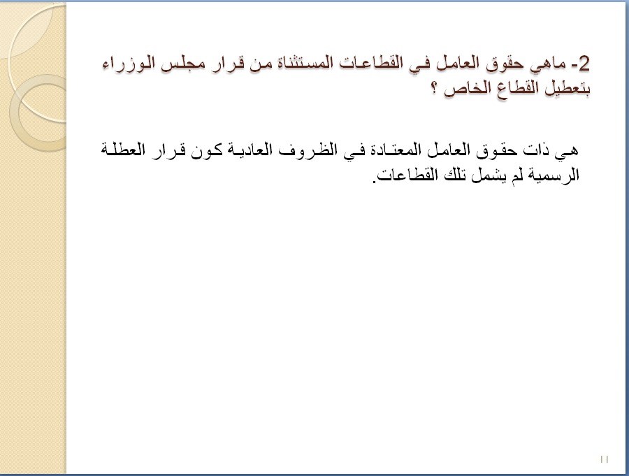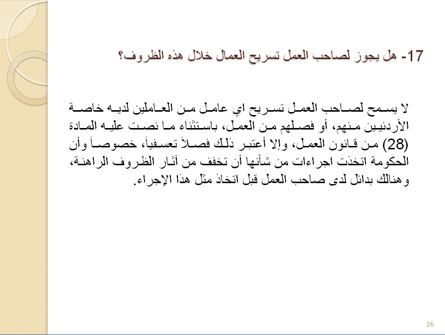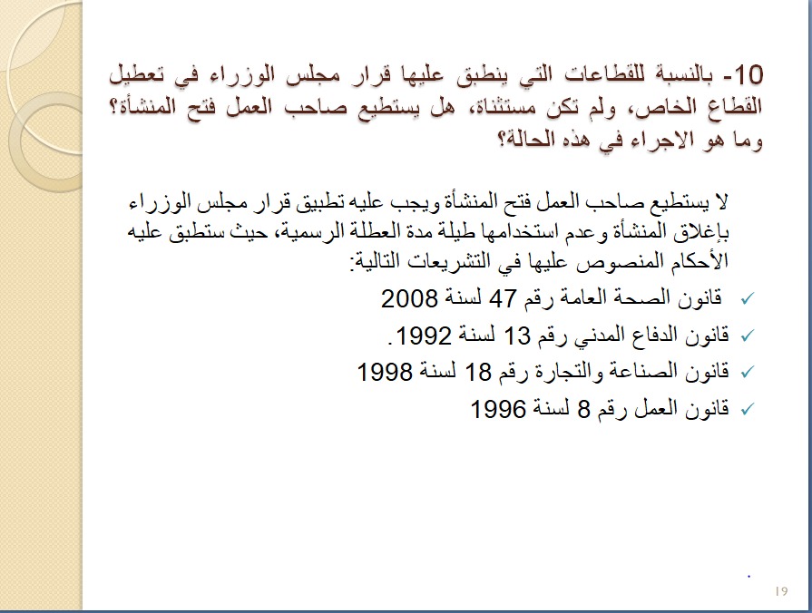 اصدرت وزارة العمل الليلة دليل سؤال وجواب بخصوص قرارات الحكومة الأخيرة ذات العلاقة بمؤسسات القطاع العام والقطاع الخاص وتعليمات وزير العمل رئيس مجلس الخدمة المدنية بخصوص حقوق وواجبات الموظفين والعاملين، خلال فترة الجهود الوطنية لمكافحة انتشار فايروس كورونا