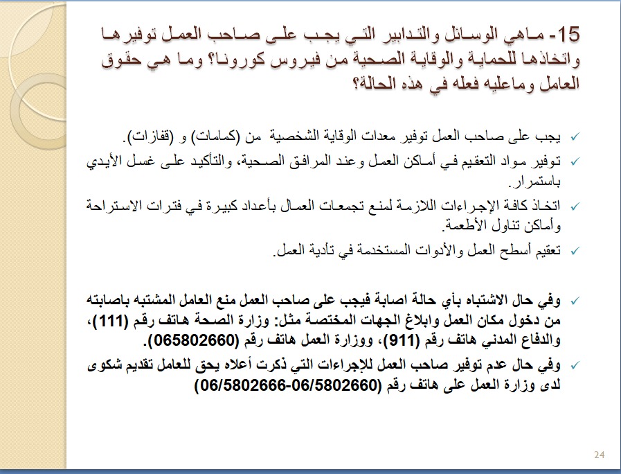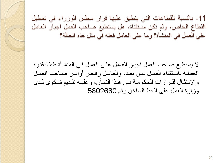 وزارة العمل تصدر دليل سؤال وجواب، لتوضيح كل ما يتعلق بالعامل وصاحب العمل بالإضافة إلى موظفي القطاع العام من حيث الحقوق والواجبات خلال الظروف الاستثنائية الراهنة