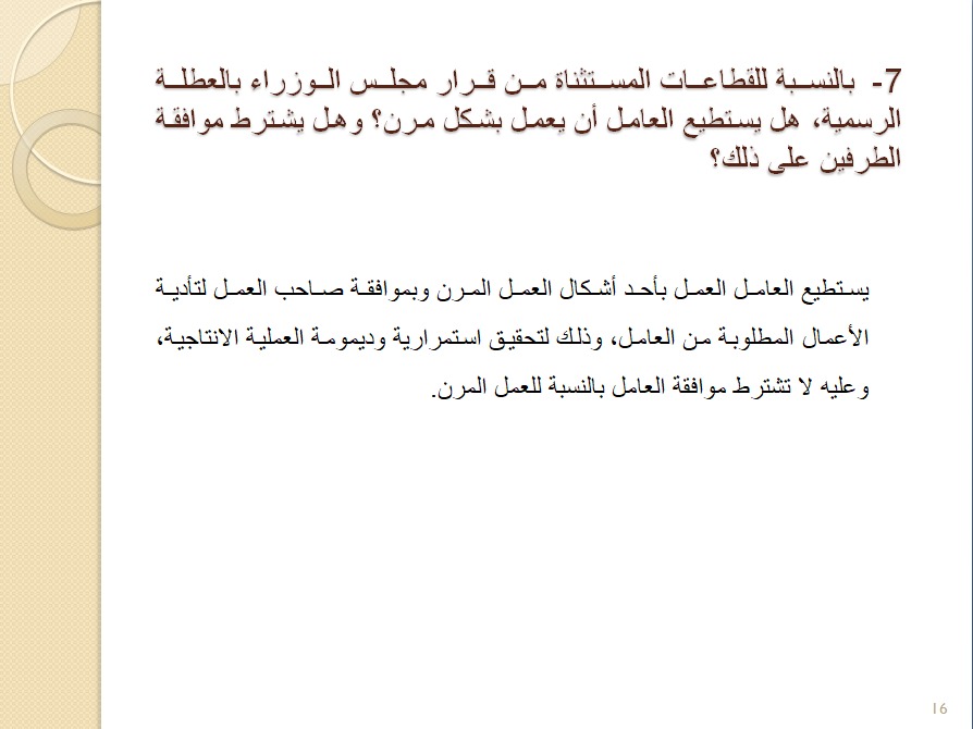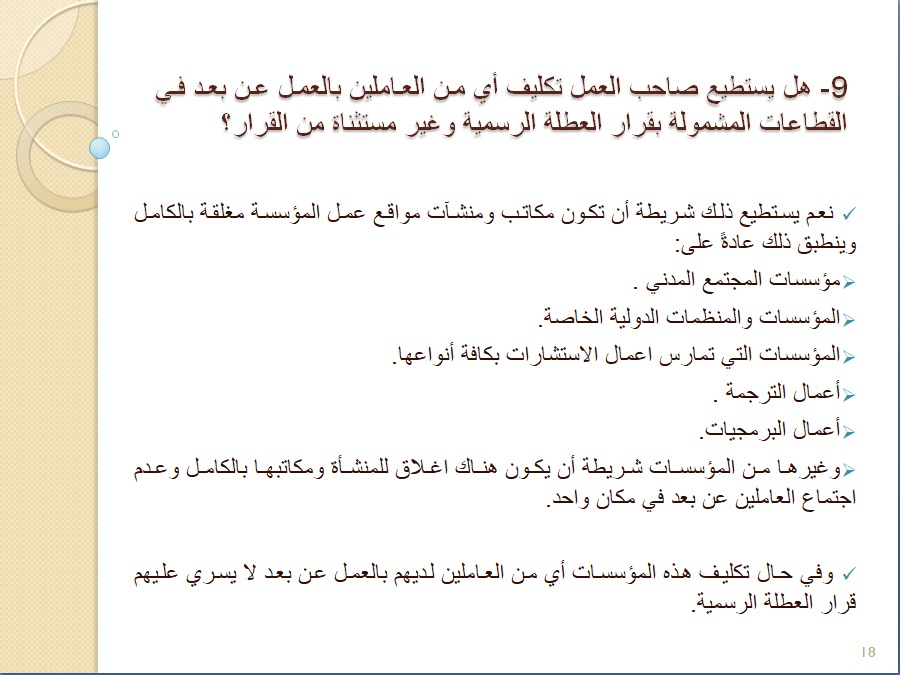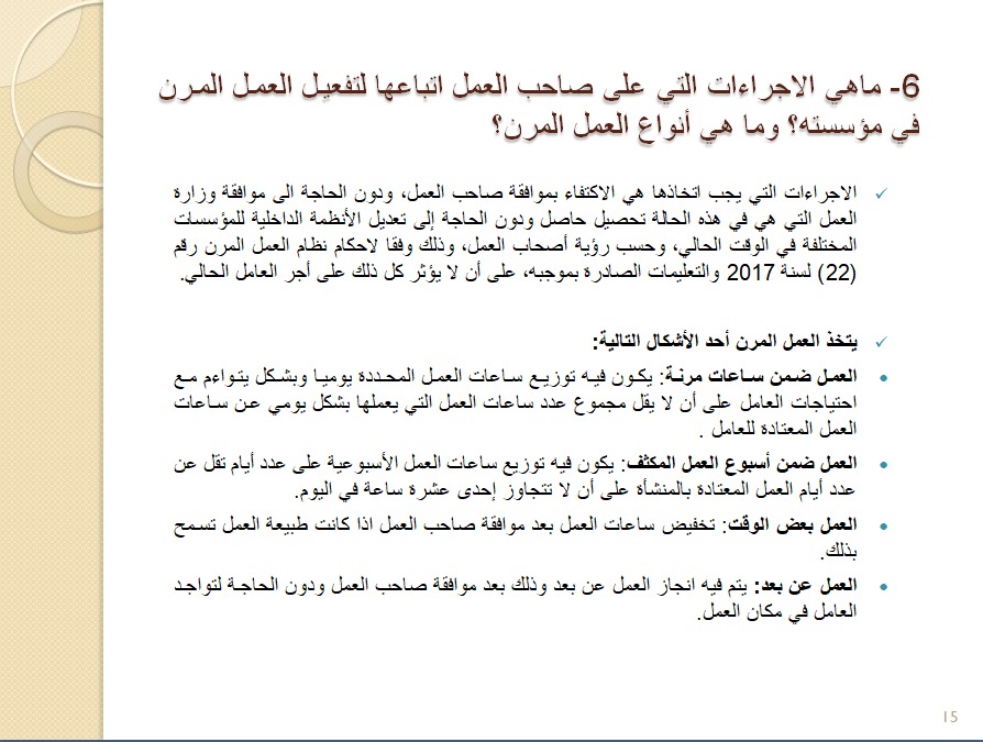 كما اوضح الدليل الاجراءات التي على صاحب العمل اتباعها لتفعيل العمل المرن في مؤسسته وما هي أشكال العمل المرن وامثلة عليه.