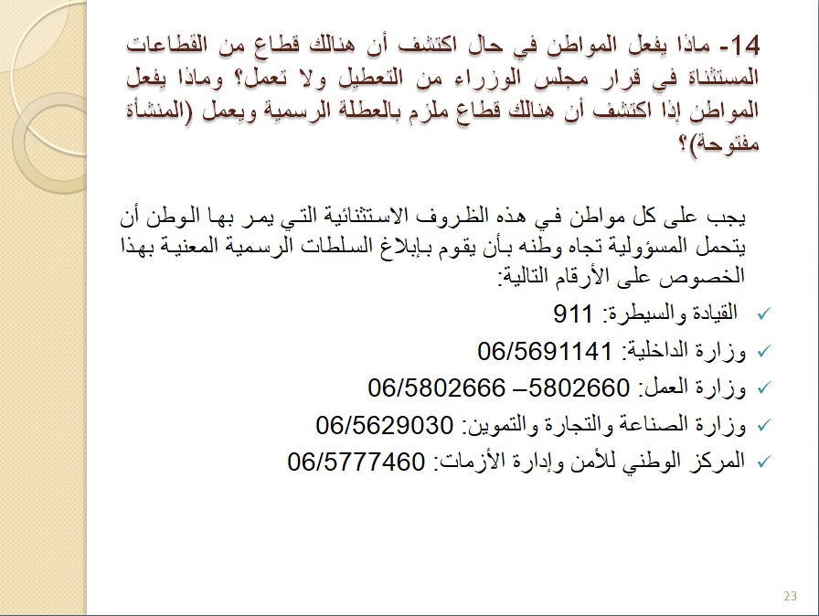 هذا وقد جاء الدليل جامعا لما ورد لغرفة السيطرة والعمليات في الوزارة من اسئلة واستفسارات خلال اليومين الماضيين بحيث تكون الاجابات واضحة ودقيقة وموحدة.