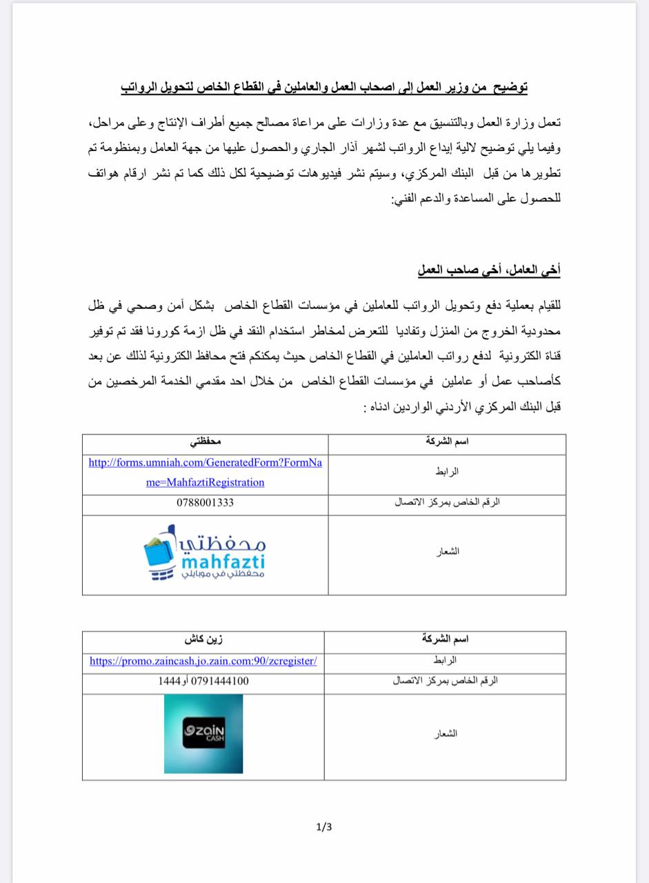 تعمل وزارة العمل وبالتنسيق مع عدة وزارات على مراعاة مصالح جميع أطراف الإنتاج وعلى مراحل، وفيما يلي توضيح لالية إيداع الرواتب لشهر آذار الجاري والحصول عليها من جهة العامل وبمنظومة تم تطويرها من قبل البنك المركزي، وسيتم نشر فيديوهات توضيحية لكل ذلك كما تم نشر ارقام هواتف للحصول على المساعدة والدعم الفني: