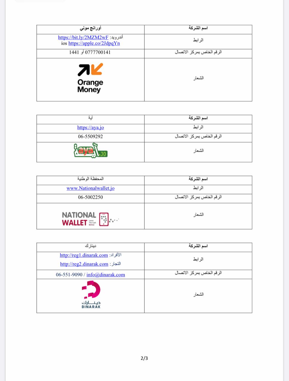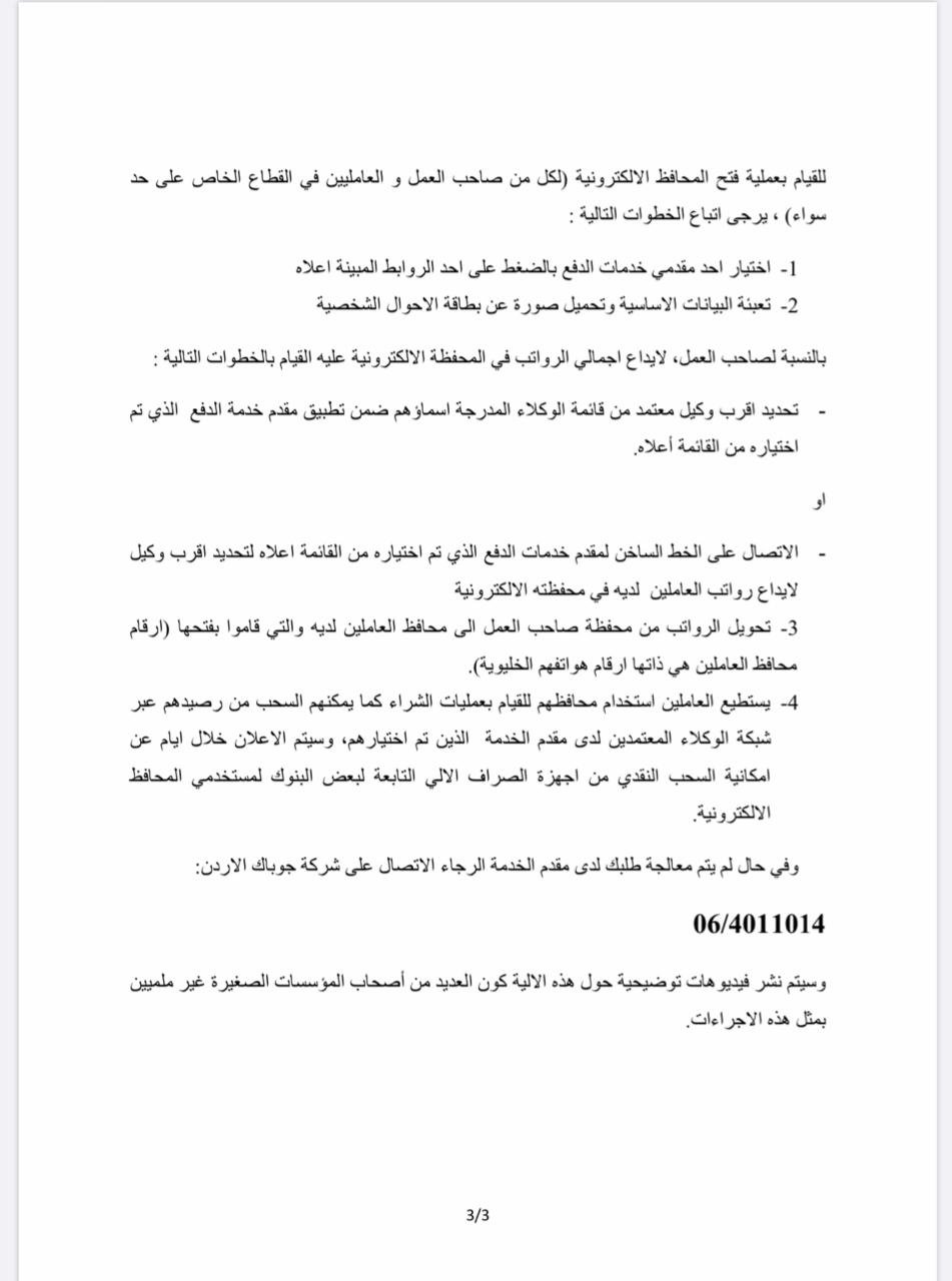 للقيام بعملية دفع وتحويل الرواتب للعاملين في مؤسسات القطاع الخاص بشكل آمن وصحي في ظل محدودية الخروج من المنزل وتفاديا للتعرض لمخاطر استخدام النقد في ظل ازمة كورونا فقد تم توفير قناة الكترونية لدفع رواتب العاملين في القطاع الخاص حيث يمكنكم فتح محافظ الكترونية لذلك عن بعد كأصاحب عمل أو عاملين في مؤسسات القطاع الخاص من خلال احد مقدمي الخدمة المرخصين من قبل البنك المركزي الأردني الواردين ادناه :