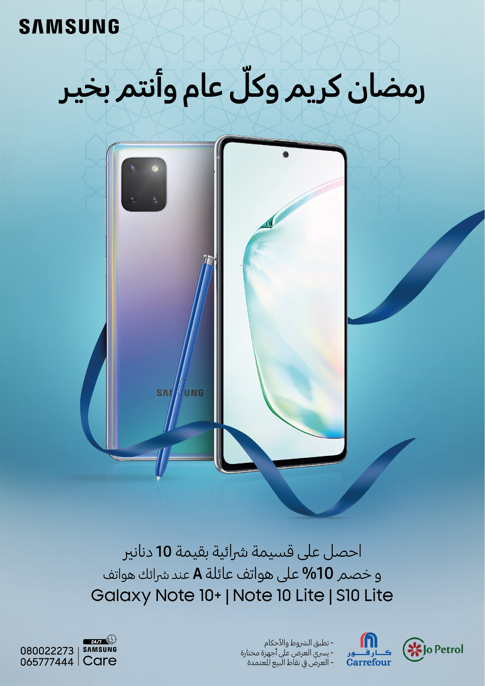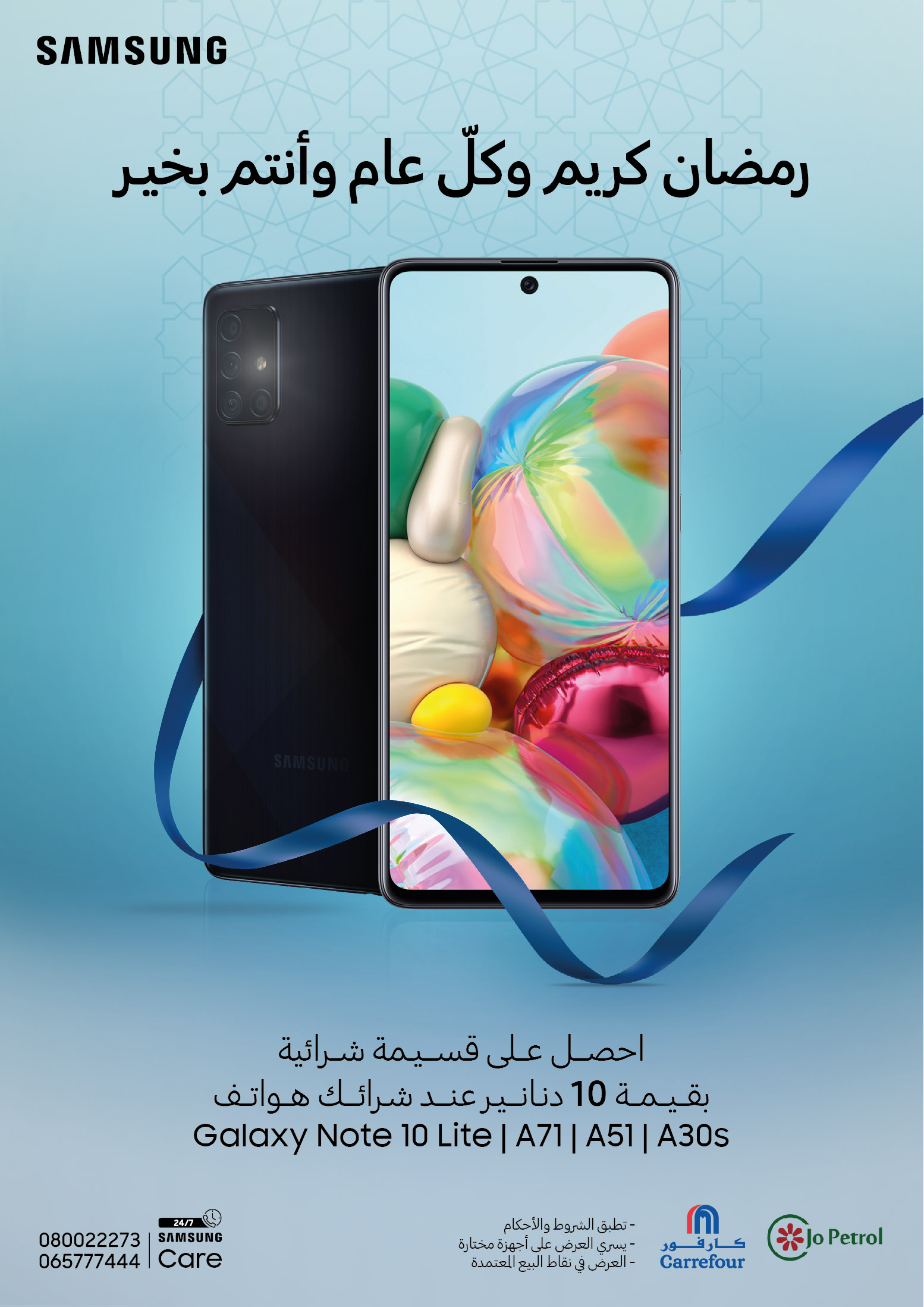 كذلك، تقدم "سامسونج" لمن يبادرون بشراء أي من هواتف سلسلة A، طراز A71، وA51، وA30s، أو Galaxy Note 10 Lite قسائم شرائية من محطة جوبترول أو متجر كارفور بقيمة 10 دنانير.