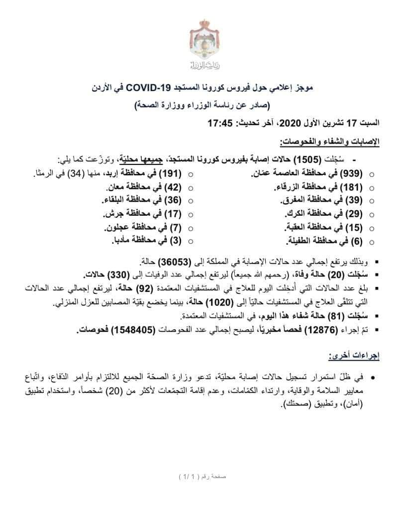 *موجز إعلامي حول فيروس كورونا المستجد COVID-19 في الأردن* (صادر عن رئاسة الوزراء ووزارة الصحة) السبت 17 تشرين الأول 2020، آخر تحديث: 17:45