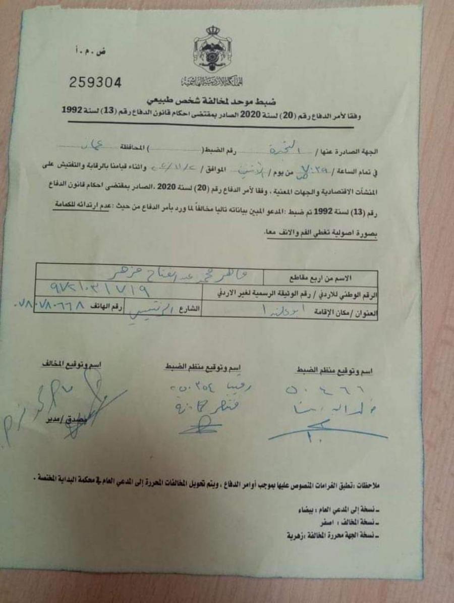 ورصدت الدستور مخالفة لاحد المواطنين جراء عدم تقيده بارتداء الكمامة بصورة اصولية تغطي الفم والانف معان وذلك لمواطن في منطقة ابو علندا في العاصمة عمان.