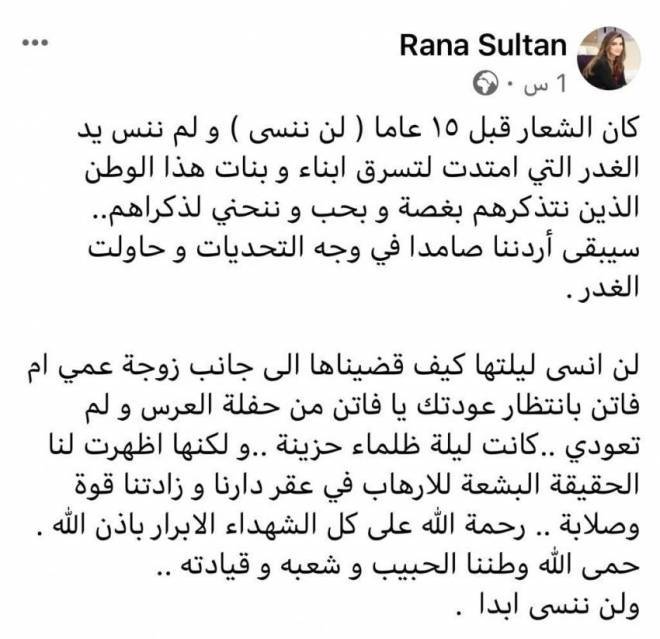 وقالت سلطان في منشور لها عبر فيسبوك: "كان الشعار قبل ١٥ عاما ( لن ننسى ) و لم ننس يد الغدر التي امتدت لتسرق ابناء و بنات هذا الوطن الذين نتذكرهم بغصة و بحب و ننحني لذكراهم.. سيبقى أردننا صامدا في وجه التحديات و حاولت الغدر".