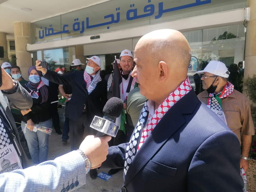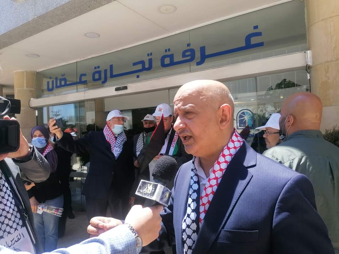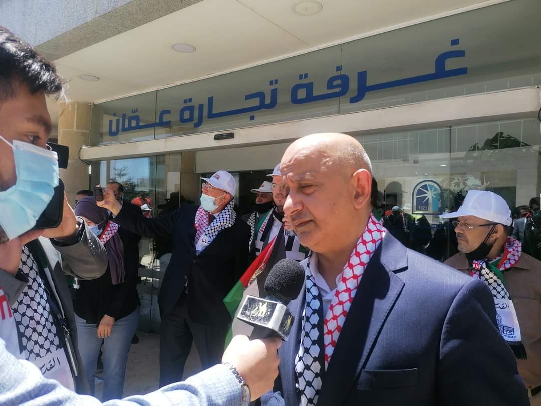 وجدد التأكيد على ان القطاع التجاري والخدمي بعموم المملكة يقف الى جانب تجار وصناع فلسطين الصابرين والصامدين رغم كل ممارسات الاحتلال البغيض لعرقلة اعمالهم وتهجيرهم وبخاصة من مدينة القدس المحتلة للمضي في تهويدها.