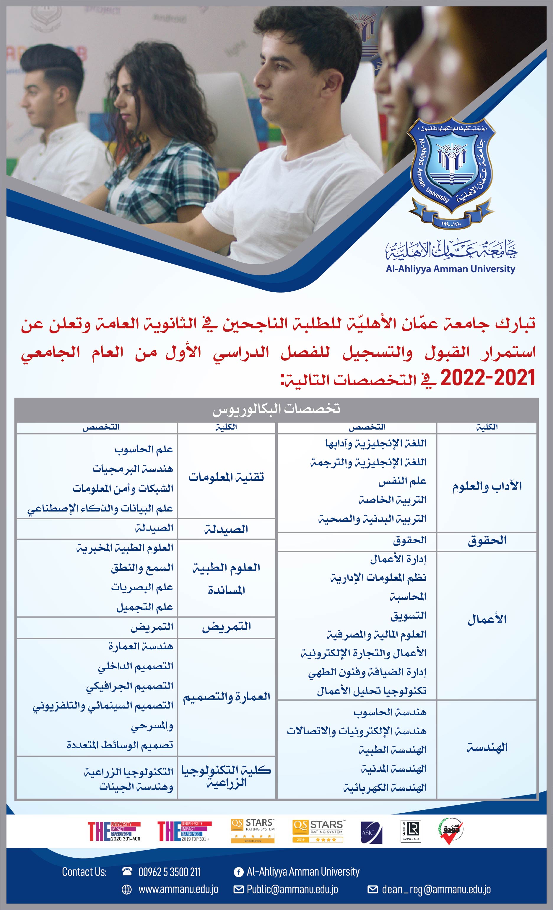 تبارك جامعة عمان الأهلية للطلبة الناجحين في الثانوية العامة وتعلن عن استمرار القبول والتسجيل للفصل الدراسي الأول من العام الجامعي 2021-2022 في تخصصات درجة البكالوريوس المذكورة في الاعلان المرفق .