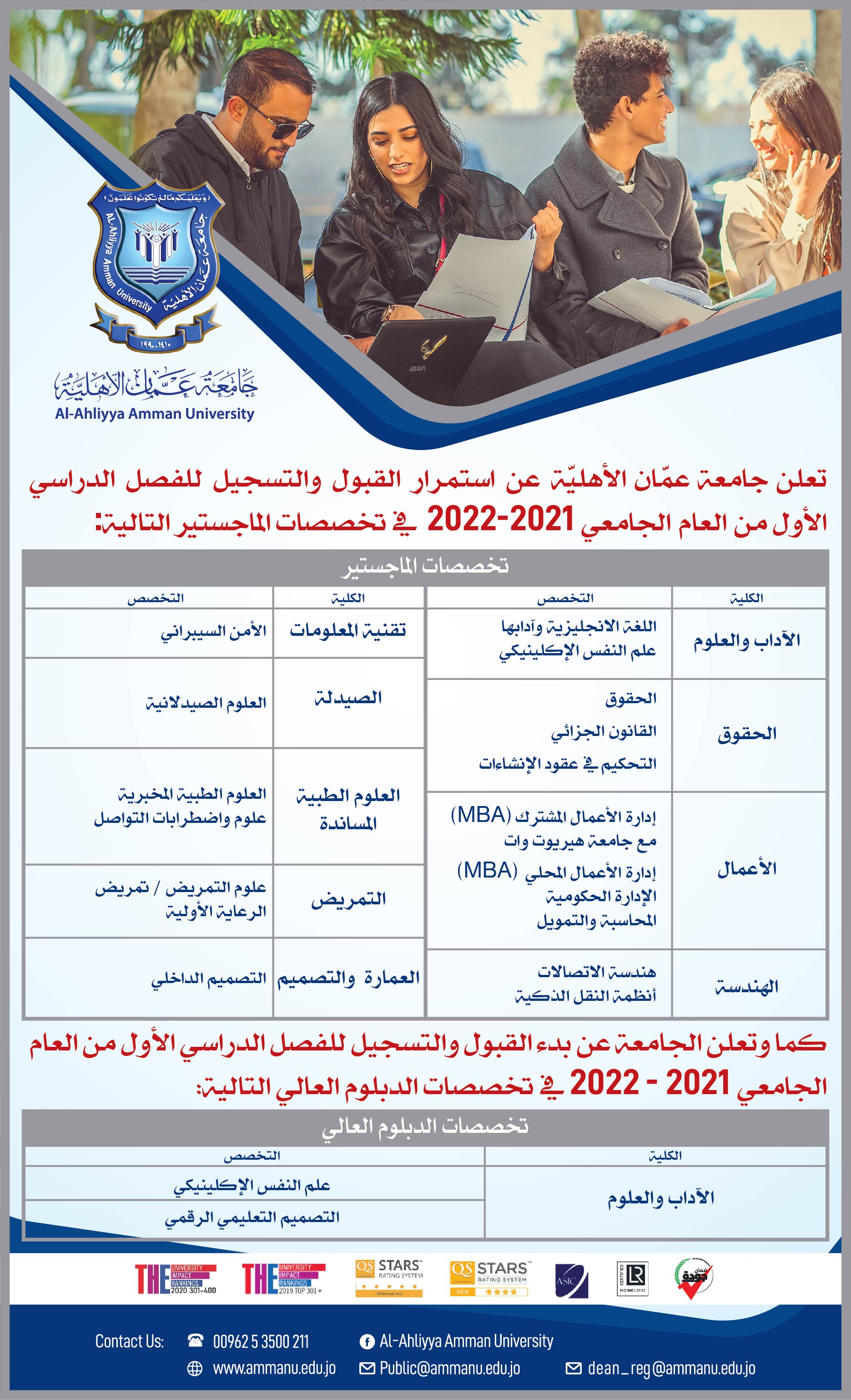تعلن جامعة عمان الأهلية عن استمرار القبول والتسجيل للفصل الدراسي الأول من العام الجامعي 2021-2022 في تخصصات درجة الماجستيروالدبلوم العالي المذكورة في الاعلان المرفق .