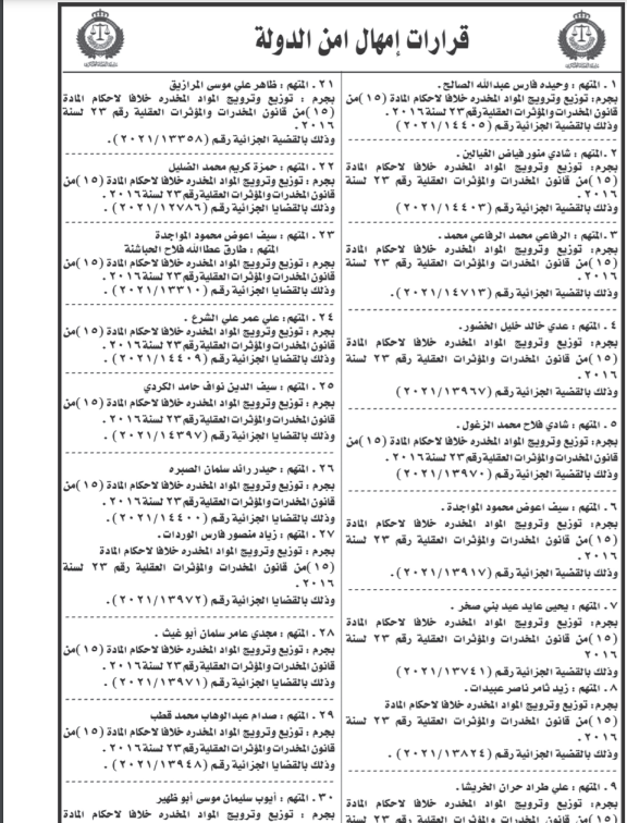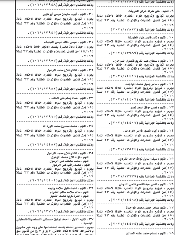 ونشرت المحكمة الخميس، أسماء المتهمين، عملا بأحكام المادة 243 /2 من قانون أصول المحاكمات الجزائية رقم 9 لسنة 1961.