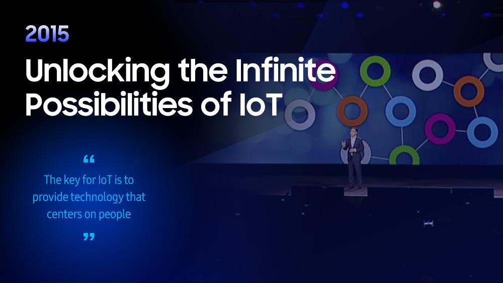 في كلمتها لنسخة العام 2015 من المعرض، قدمت سامسونج مخططها للمستقبل المتوقع لعصر إنترنت الأشياء الذي كانت الشركة تعتزم تحقيقه. وتصور سامسونج من خلاله عالماً تتقدم فيه جميع أنواع المنتجات مع التكنولوجيا الرقمية. وإضافة إلى ذلك، قدمت سامسونج تقنياتها الأساسية لتحقيق هذا العالم القائم على إنترنت الأشياء، بما في ذلك أجهزة الاستشعار فائقة الصغر، والتي تتمتع بكفاءة عالية في استخدام الطاقة، والذكاء وشرائح أشباه الموصلات. وأكد بي كو يون، الرئيس والمدير التنفيذي لقسم المنتجات الاستهلاكية في ذلك الوقت على أهمية المنصات المفتوحة من أجل التوصل إلى ترجمة حقيقية لهذه الرؤية، وكشف بناءً على ذلك عن منصة "الأشياء الذكية" SmartThings التي تعتبر مركز جميع أنواع الأجهزة والخدمات الذكية.