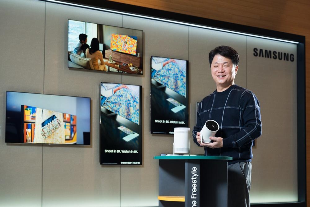 جونغراي كيم من وحدة أعمال الشاشات في سامسونج للإلكترونيات يعرض بفخر The Freestyle، الشاشة المحمولة الجديدة التي تم تقديمها في المعرض.