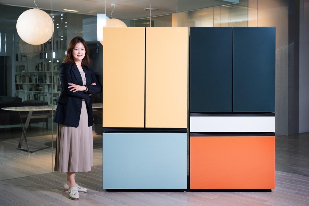 تيلي لي، نائب رئيس قسم الأجهزة المنزلية في سامسونج ورئيس مجموعة تخطيط منتجات المطبخ، مع ثلاجات الباب الفرنسي المصممة حسب الطلب من سامسونج