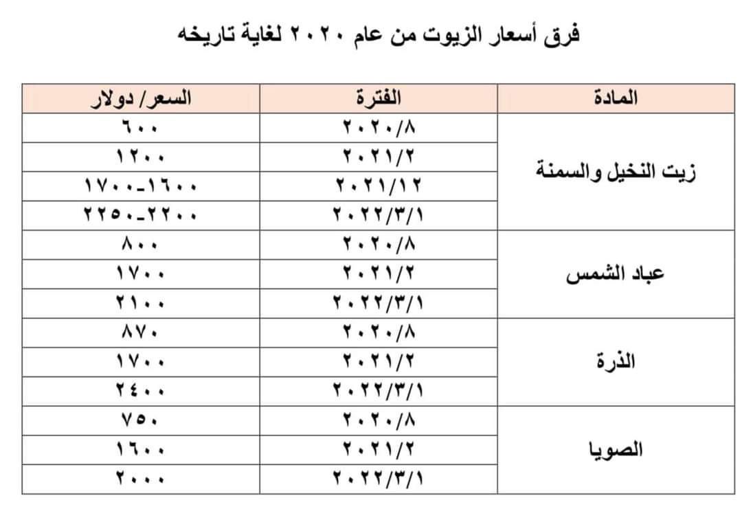 في الصورة المرفقة استعراض للارتفاعات التي طرأت على اسعار الزيوت النباتية واصل ميناء العقبة خلال عام ونصف تقريبا .