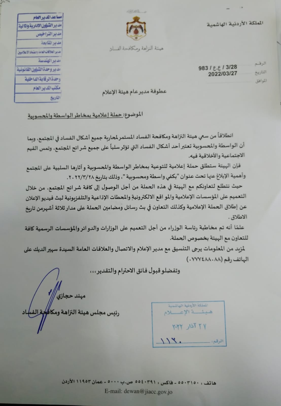 حملة اعلامية بمخاطر الواسطة والمحسولية ستطلقها هيئة مكافحة الفساد 2022-03-28 / 07:14am المركب الاخباري