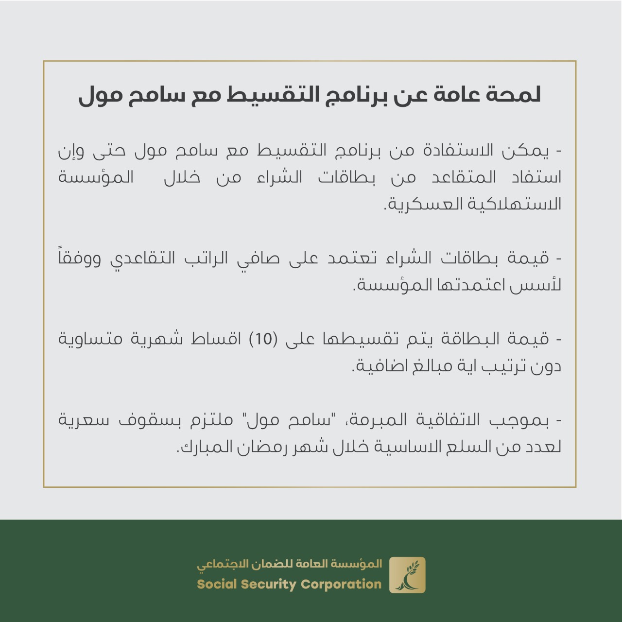 أعلنت المؤسسة العامة للضمان الاجتماعي عبر مركزها الاعلامي عن التوسع في برنامج تقسيط لمتقاعدي الضمان الاجتماعي الأردنيين وأبناء قطاع غزة وأبناء الأردنيات بمناسبة قرب حلول شهر رمضان المبارك، وذلك بشمول كافة فروع سامح مول في المملكة.