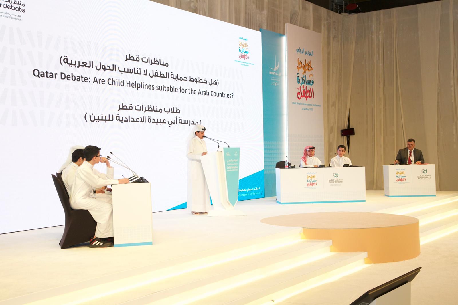 حيث ناقش المؤتمر في اليوم الثاني عدة محاور ذات الصلة بآليات حماية الطفل، ففي الجلسة الأولى تم التنسيق مع مركز قطر للمناظرات لعرض مناظرة بين طلاب مدرسة أبي عبيدة الإعدادية للبنين، فقد تم تشكيل فريق معارض وآخر مؤيد عن أهمية خطوط حماية الطفل، من خلال طرح موضوع إمكانية الحاجة لخطوط مساندة الطفل بالنسبة للدول العربية.