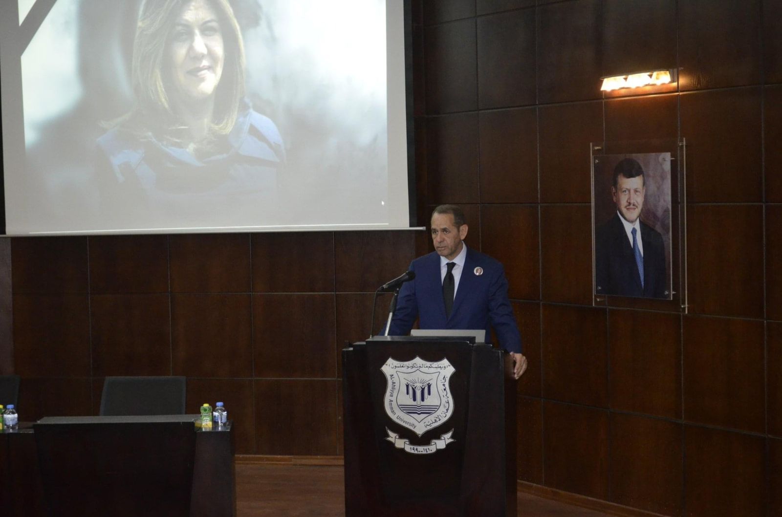 وبدأ الحفل الذي أقيم في مدرج نزار قباني بالوقوف دقيقة صمت تكريماً لروح الشهيدة، تلاها كلمة لرئيس الجامعة الذي استعرض حجم المصاب والدور الأردني بقيادة جلالة الملك عبدالله الثاني في دعم صمود الشعب الفلسطيني امام ممارسات جيش الاحتلال ومحاولات تكميم الأفواه كما حصل في حادثة اغتيال الشهيدة أبو عاقلة.