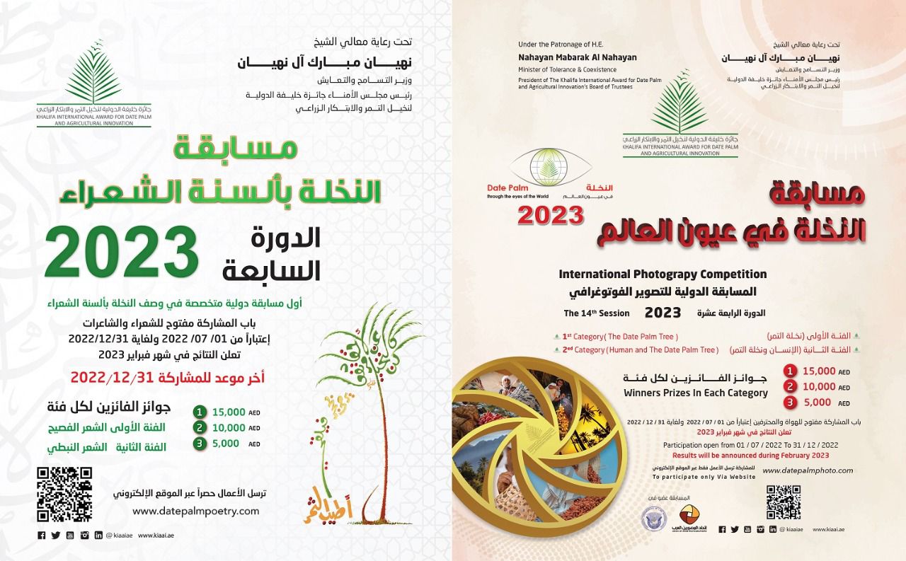 تحت رعاية معالي الشيخ نهيان مبارك آل نهيان وزير التسامح والتعايش رئيس مجلس أمناء جائزة خليفة الدولية لنخيل التمر والابتكار الزراعي، أعلنت الأمانة العامة للجائزة عن فتح باب المشاركة في المسابقة الدولية لتصوير شجرة نخيل التمر بعنوان (النخلة في عيون العالم) في دورتها الرابعة عشرة 2023. حيث دعت الفنانين محبي التصوير الضوئي هواة ومحترفين من كافة أنحاء العالم، للمساهمة في هذه المسابقة الدولية تقديراً منا للنخلة وتعزيزاً لدور عدسة المصور في إغناء ذاكرة الوطن وإحياء تراثه البيئي. بالإضافة الى فتح باب المشاركة في المسابقة الدولية (النخلة بألسنة الشعراء) في دورتها السابعة 2023. كما دعت كافة الأدباء والشعراء والشاعرات من كافة الدول العربية، للمساهمة في هذه المسابقة الدولية، تقديراً للنخلة بهدف توظيف الشعر العربي بشقيه (النبطي والفصيح) كوسيلة مهمة في تنمية وعي الجمهور لأهمية شجرة نخيل التمر من الناحية التراثية والزراعية والغذائية والاقتصادية، وتعزيزاً لدور الشعر في إغناء ذاكرة الوطن وإحياء تراثه الزراعي.
