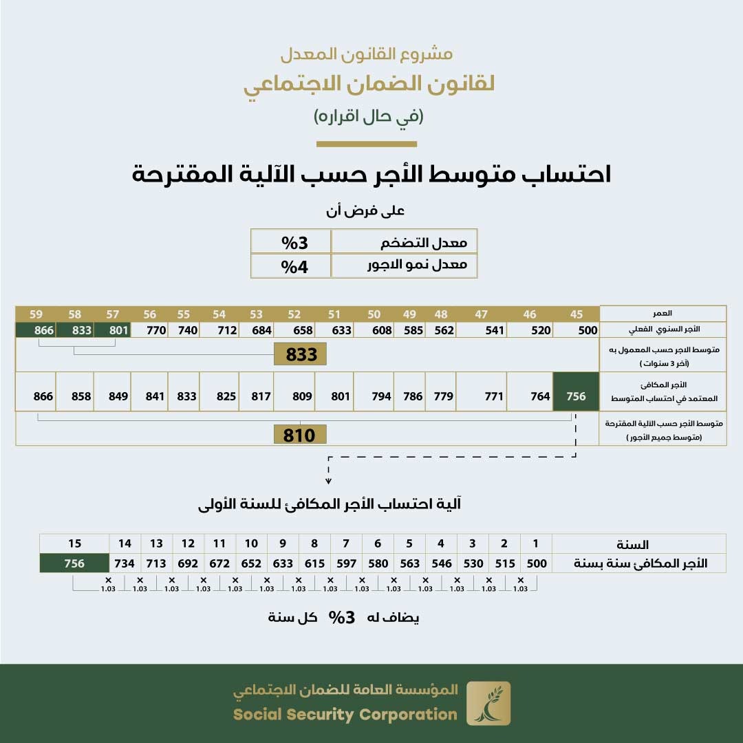 وبينت المؤسسة أن متوسط الأجر الذي سيتم على أساسه احتساب الراتب التقاعدي سيكون مبنياً على كافة أجور المؤمن عليه المشمولة بالضمان الاجتماعي، مع تعديل الأجور السنوية بواقع معدلات التضخم المسجلة في السنوات اللاحقة لتحقق الأجر. فالأجور السابقة التي تدخل في احتساب المتوسط سيتم تعديلها على نحو يعكس قوتها الشرائية عند التقاعد وذلك استنادا لمعدلات التضخم في كل سنة من السنوات اللاحقة لشمولها.
