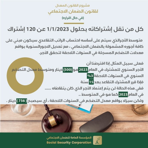 الضمان توضح آلية احتساب الراتب التقاعدي وفق مشروع القانون المعدل لمن تقل اشتراکاته بحلول 1/1/2023 عن (120) اشتراكاً