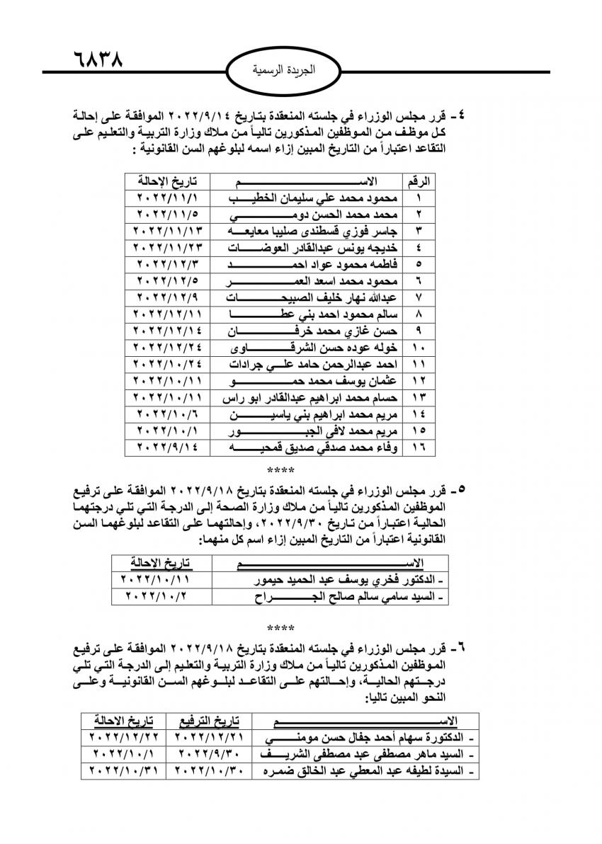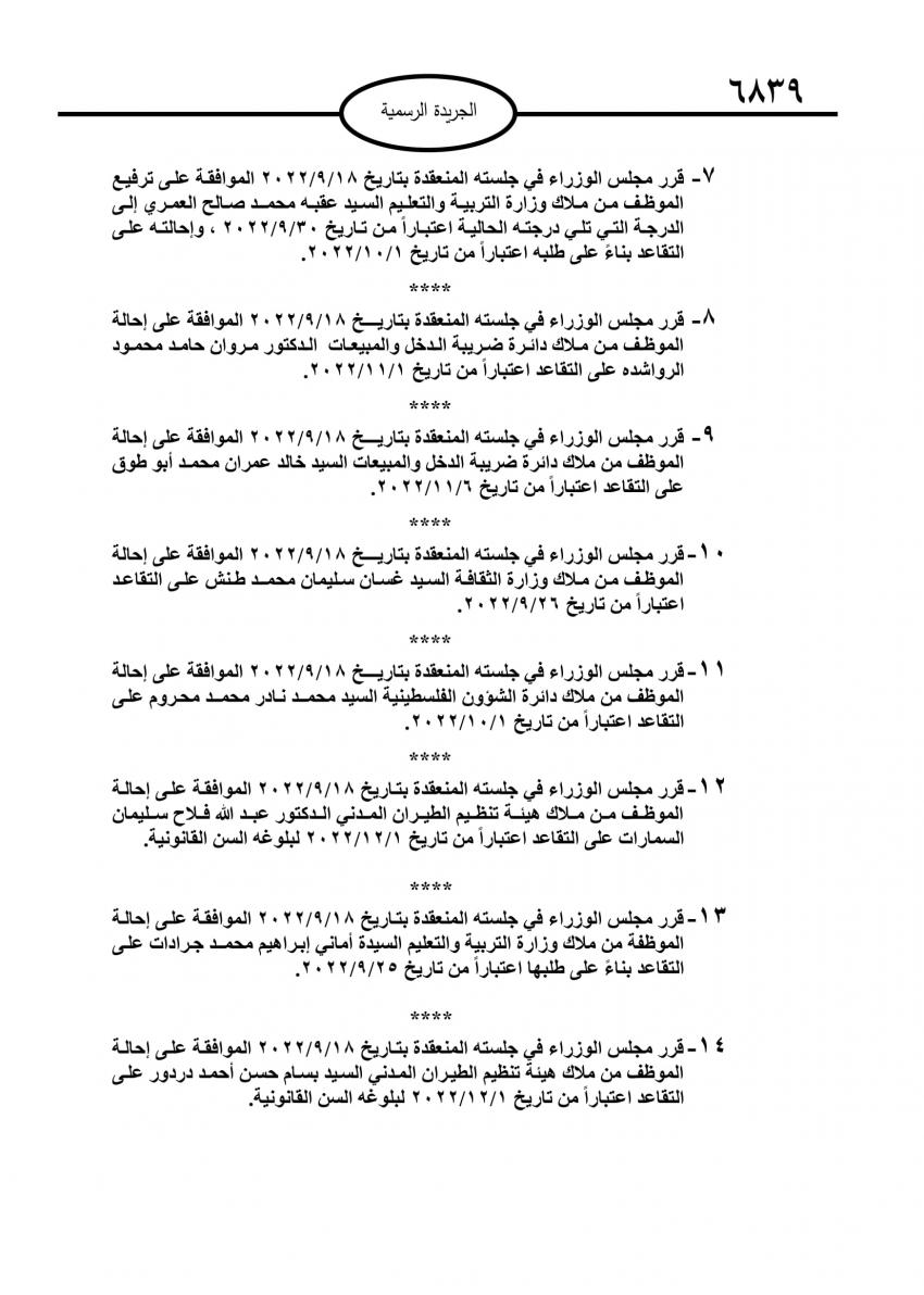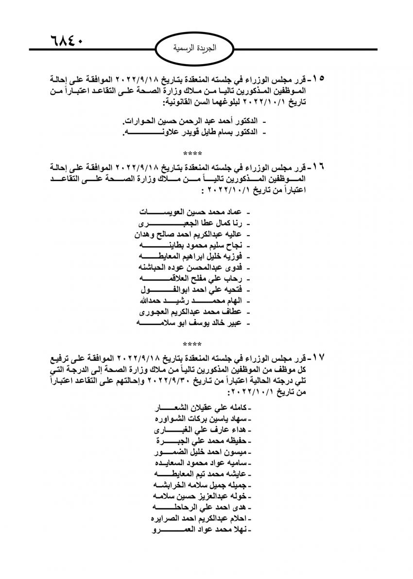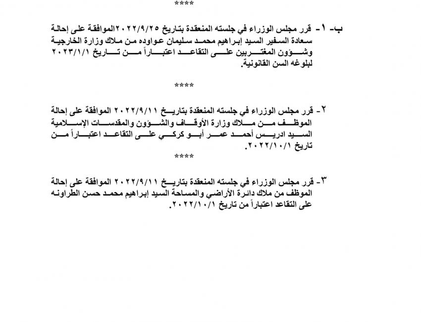 صدر في عدد الجريدة الرسمية اليوم الأحد قرارات مجلس الوزراء باحالة موظفين حكوميين إلى التقاعد، وانهاء خدمات آخرين.