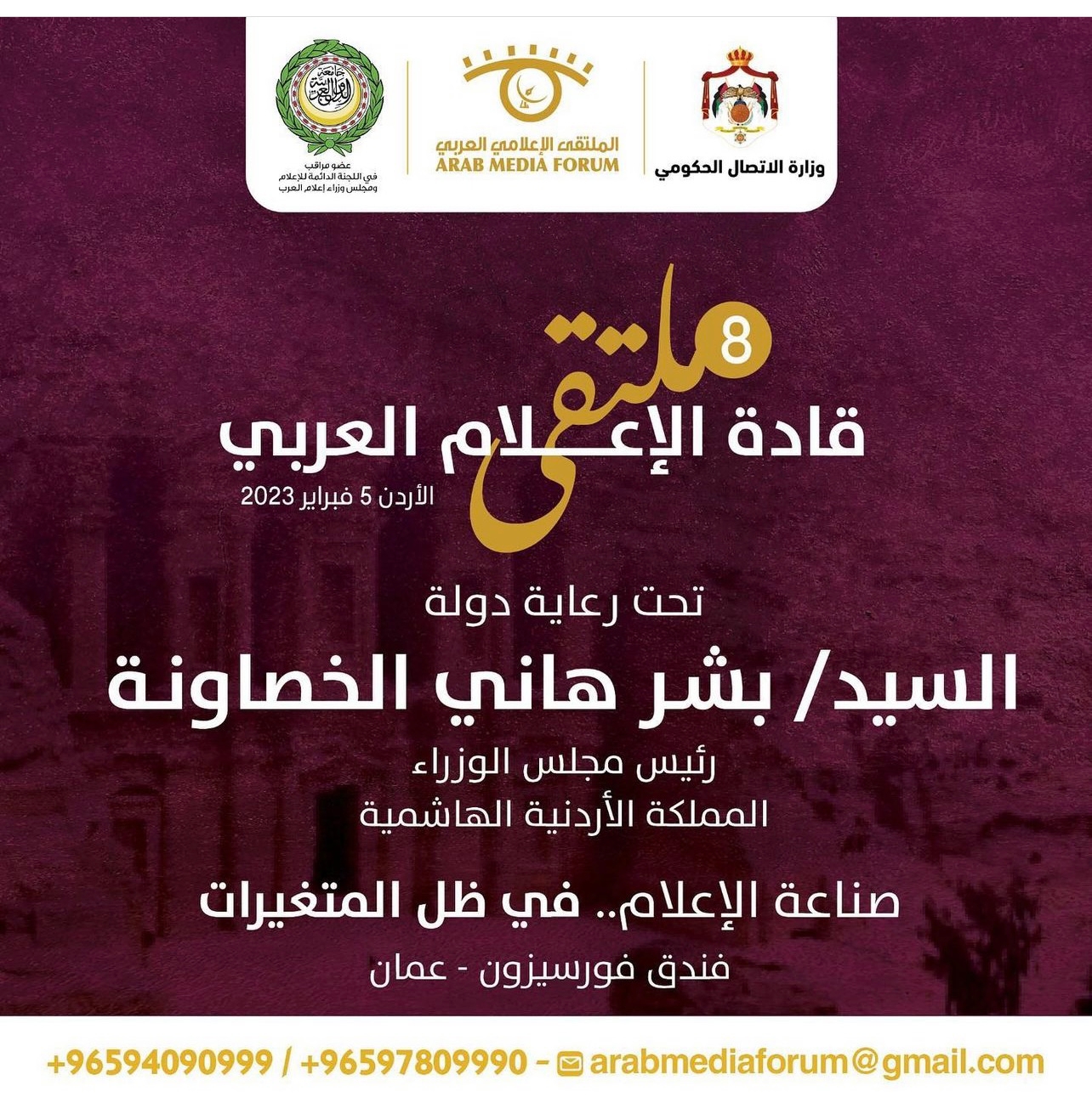 تستضيف المملكة الأردنية الهاشمية يوم الأحد الموافق 5 فبراير 2023 ملتقى قادة الإعلام العربي في دورته (الثامنة) الذي تنظمه هيئة الملتقى الإعلامي العربي بالتعاون مع وزارة الإتصال الحكومي في المملكة ، تحت رعاية دولة رئيس مجلس الوزراء بشر هاني الخصاونة.