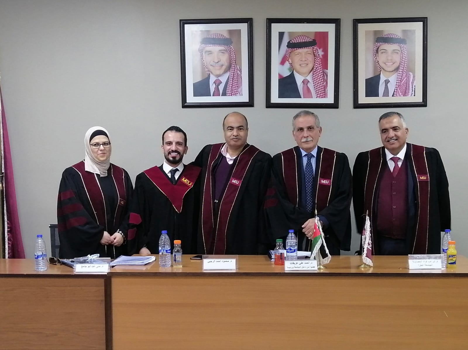 وتشكلت لجنة المناقشة برئاسة الدكتور احمد علي العريقات وعضوية كل من الدكتور محمود احمد الرجبي والدكتور ابراهيم فؤاد الخصاونة والدكتور أنس احمد بني عطا واشرف على الرسالة الدكتورة منى عيد أبو جامع .