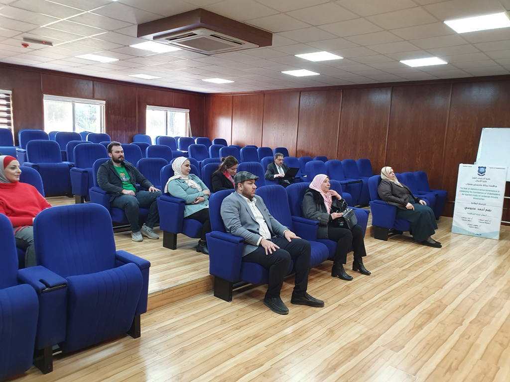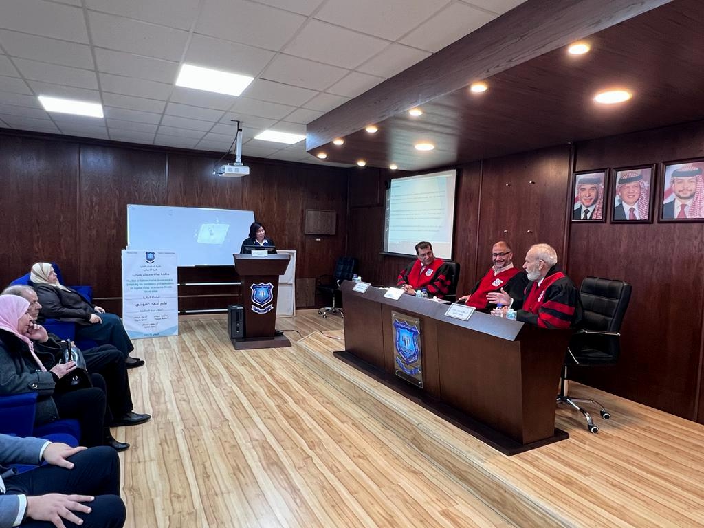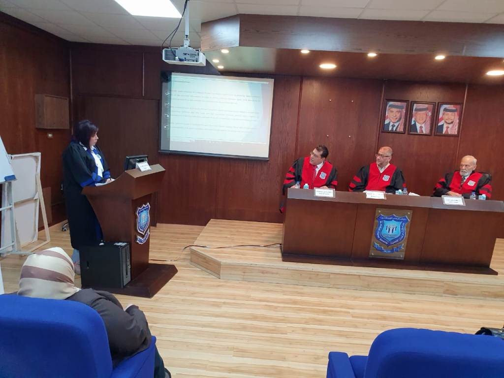وتألفت لجنة المناقشة من الأستاذ الدكتور أحمد يوسف عريقات (قسم إدارة الاعمال) رئيساً ومشرفاً ، والأستاذ الدكتور يعقوب حيدر حمدان ( قسم إدارة الاعمال) عضواً داخلياً ، والدكتور إياد بشيرحياصات ( كلية الاعمال بجامعة البلقاء التطبيقية) عضواً خارجياً، وقد أجيزت رسالة الماجستير مع بعض التعديلات الطفيفة .