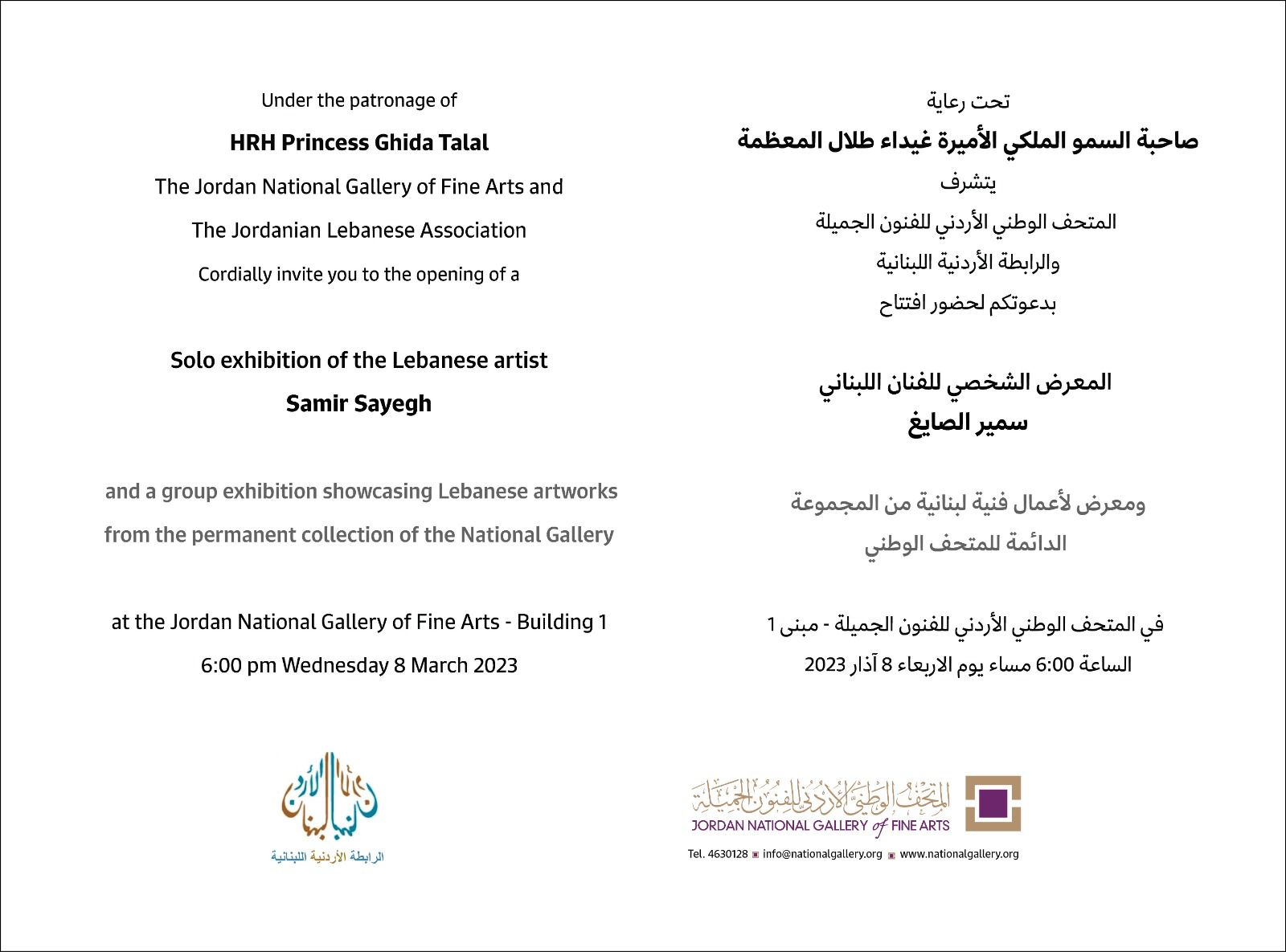 تقيم الرابطة اللبنانية في الأردن فعاليات ضمن أيام لبنانية في عمان وتشتمل الفعاليات على إقامة معرض رسم للفنان التشكيلي سمير الصايغ وفنانين لبنانيين بلوحات موجودة لدى المتحف الوطني الأردني للفنون الجميلة في جبل اللويبدة يوم الاربعاء الموافق 2023/03/8 في تمام الساعة السادسة برعاية الأميرة غيداء طلال ويستمر المعرض لمدة شهر ونصف.