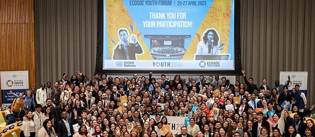 القادة الشباب لمبادرة Generation17، وهم: دانيال كالاركو، وكريستيان كامبمان، وتوي آنه نجو، يظهرون في هذه الصورة، وهم يقفون مع قادة آخرين من جميع أنحاء العالم في منتدى شباب المجلس الاقتصادي والاجتماعي 2023 الذي انعقد بمدينة نيويورك في أبريل 2023.
