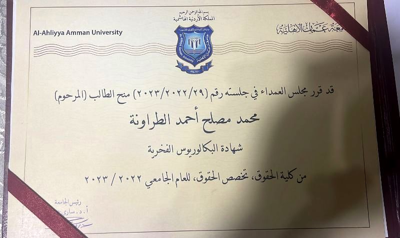 كان من المفترض أن يحضر محمد "نجل “ الاستاذ الدكتور مصلح الطراونة نائب رئيس جامعة عمان الاهلية وعميد كلية الحقوق في الجامعة " حفل تخرجه يوم السبت 22-7-2023، ولكن مشيئة الله قضت أن يغادر محمد الى جوار ربه اثر حادث سير مؤخرا ... حيث منحه مجلس عمداء جامعة عمان الاهلية شهادة البكالوريوس الفخرية بتخصص الحقوق ...واستلمت الشهادة نيابة عنه شقيقته ناتالي ......... وقد كتب أ.د .مصلح الطراونة كلمة رثاء تدمي القلوب لنجله المرحوم محمد في يوم تخرّجه لكنه رفض نشرها لئلا يؤذي مشاعر رفاقه الخريجين ،هذا نصها :