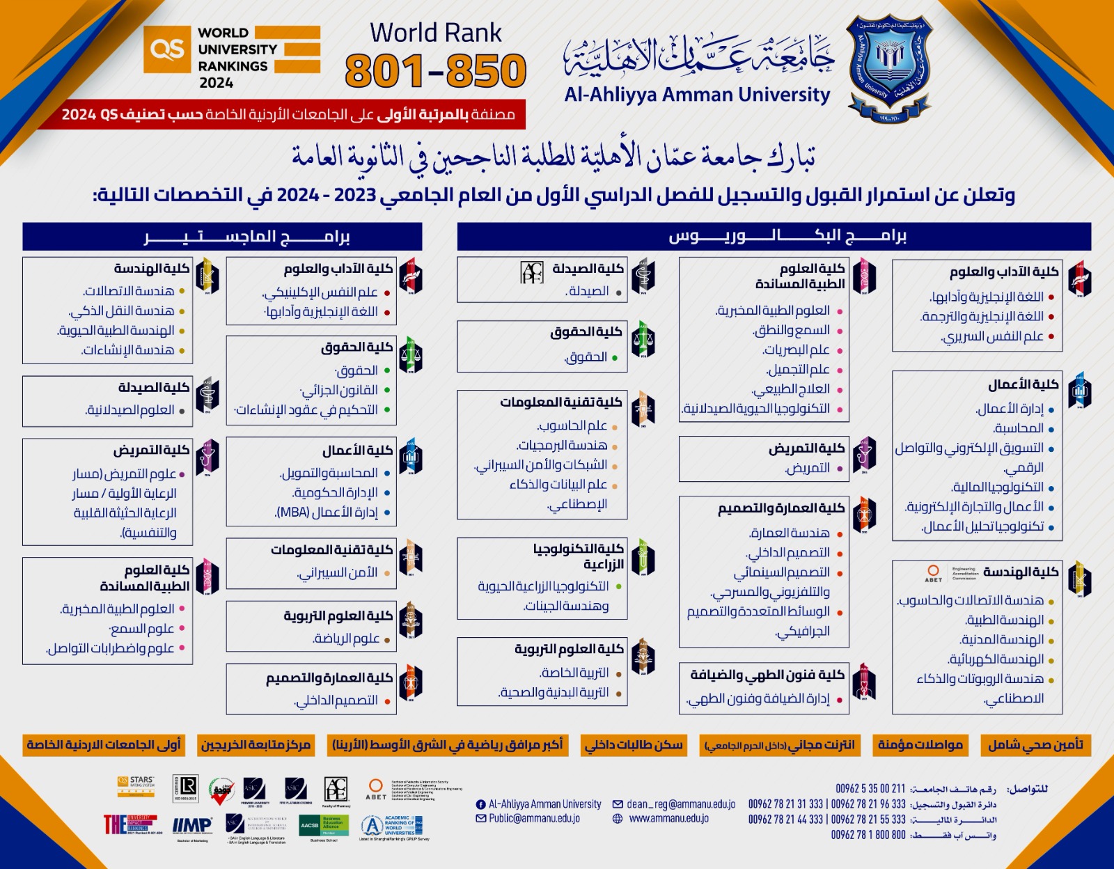 عمان الأهلية تبارك للناجحين بالثانوية العامة وتعلن عن استمرار القبول والتسجيل بكافة تخصصاتها للفصل الدراسي الاول 2023-2024