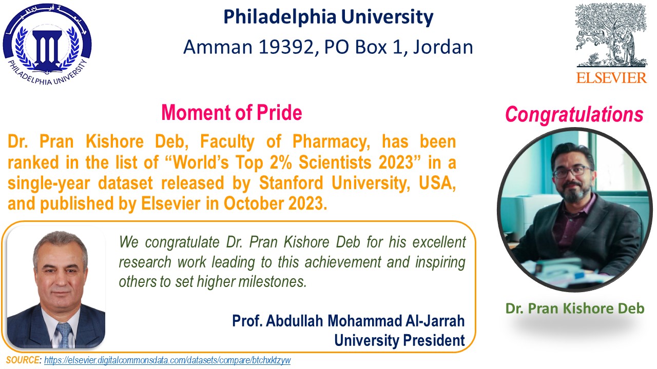 تم تصنيف الدكتور بران كيشور ديب الأستاذ في كلية الصيدلة و المتخصص في الكيمياء الصيدلية الطبية في جامعة فيلادلفيا كواحد من أفضل 2٪ من الباحثين في العالم من عام 2020 إلى 2023 ضمن فئة السنة الواحدة ضمن تصنيف جامعة ستانفورد في الولايات المتحدة ونشرتها دار النشر إلسي فير. الدكتور بران كيشور يعمل مع جامعة فيلادلفيا منذ عام 2016 وهو باحث نشط، ولديه أكثر من 10 سنوات من الخبرة في التدريس الأكاديمي والبحث. يعتبر مجال بحثه من المجالات الهامة جداً حيث يتضمن تصميم الأدوية بمساعدة الحاسوب، وتخليق واكتشاف كيانات كيميائية جديدة مثل مضادات مستقبلات الأدينوزين، ومضادات الالتهاب، ومضادات للسل، ومضادات للسرطان. الدكتوركيشور حاز على العديد من المنح وجوائز بحثية وطنية ودولية متنوعة، ولديه أكثر من 135 منشورًا بما في ذلك أبحاث ومراجع وفصول كتب في مجلات دولية مرموقة تم مراجعتها بواسطة الأقران. كما قام بتحرير كتاب ومشاركة تحرير العديد من القضايا الموضوعية كمحرر ضيف مدعو. وبهذه المناسبة تفخر الجامعة ممثلة بالأستاذ الدكتور عبدالله الجراح رئيس الجامعة و الدكتور يزن البطاينة عميد كلية الصيدلة بإنجازاته وتتمنى له التوفيق في جميع مساعيه المستقبلية.