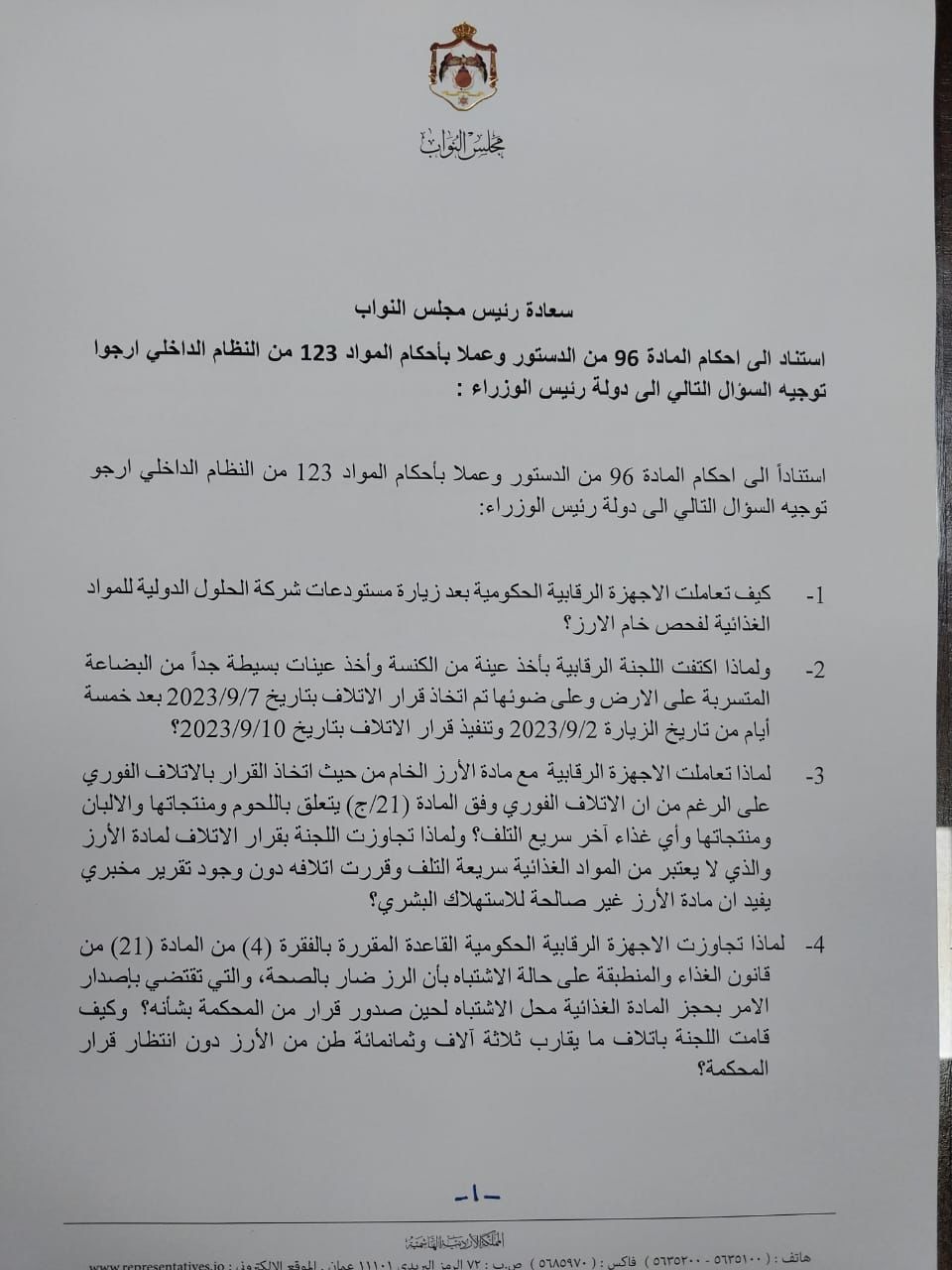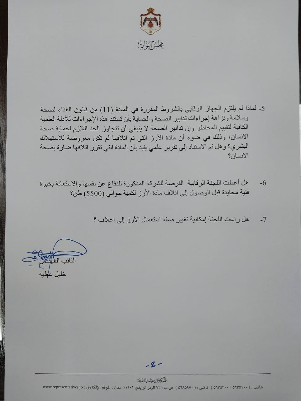 6- هل أعطت اللجنة الرقابية الفرصة للشركة المذكورة للدفاع عن نفسها والاستعانة بخبرة فنية محايدة قبل الوصول إلى حرق واتلاف مادة الأرز لكمية حوالي (5500) طن والذي يحصل لاول مره بتاريخ الاردن حسب معرفتي واطلاعي ؟