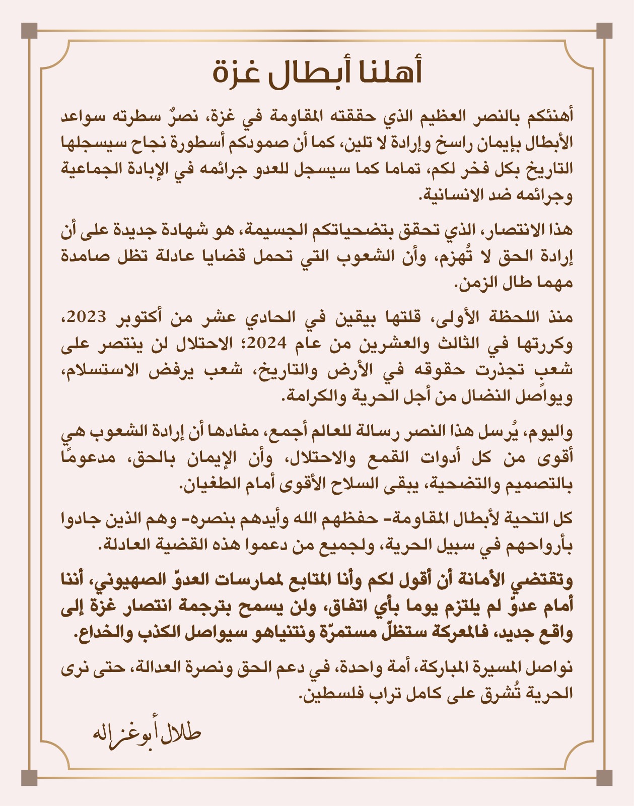 أهنئكم بالنصر العظيم الذي حققته المقاومة في غزة، نصرٌ سطرته سواعد الأبطال بإيمان راسخ وإرادة لا تلين، كما أن صمودكم أسطورة نجاح سيسجلها التاريخ بكل فخر لكم، تماما كما سيسجل للعدو جرائمه في الإبادة الجماعية وجرائمه ضد الانسانية.