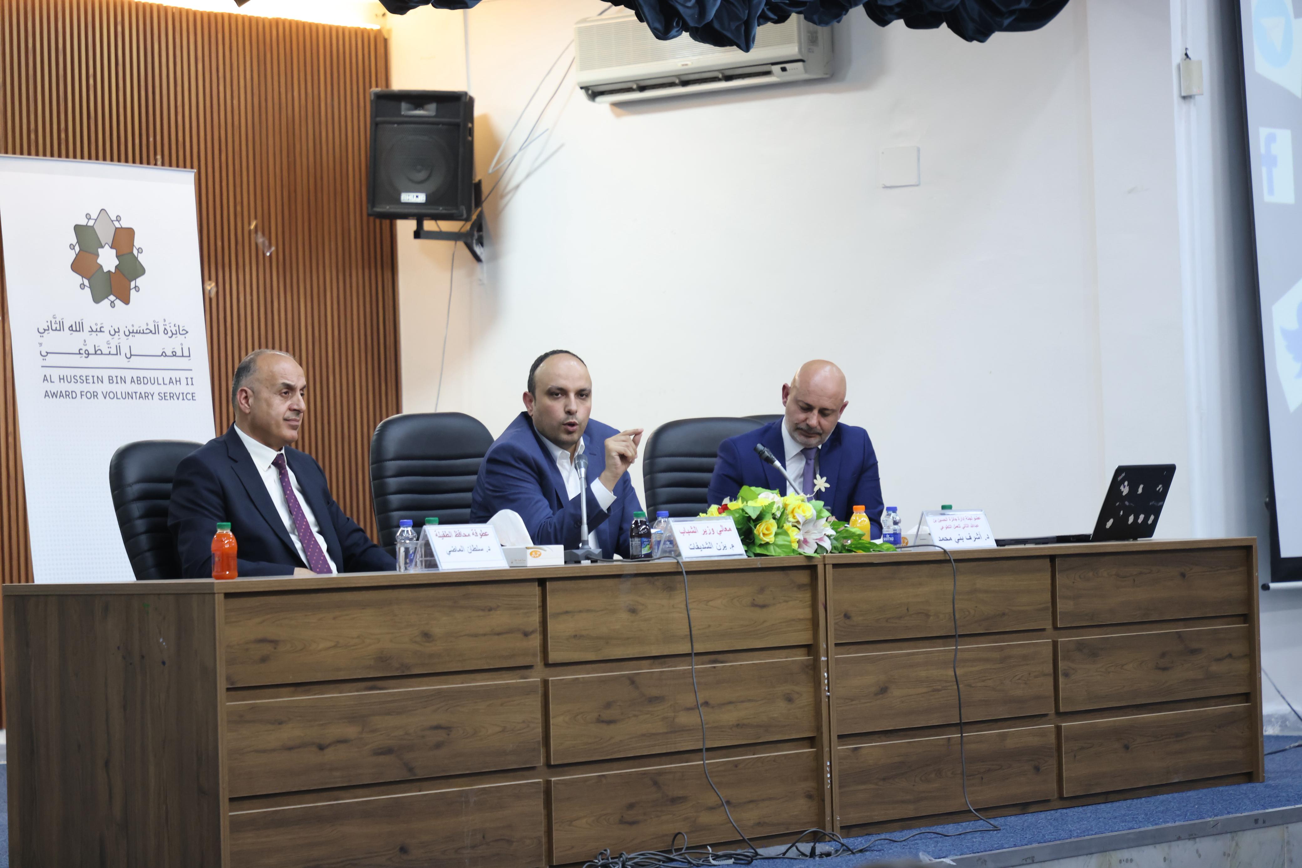 ترأس وزير الشباب نائب رئيس مجلس أمناء الجائزة المهندس يزن الشديفات الجلسة التعريفية بجائزة الحسين بن عبدالله الثاني للعمل التطوعي في دورتها الثالثة، والتي نظمتها الوزارة في محافظة الطفيلة، في مؤسسة إعمار الطفيلة، بحضور محافظ الطفيلة الدكتور سلطان الماضي ، ورئيس مجلس المحافظة مصطفي العوران ورئيس جامعة الطفيلة التقنية الدكتور بسام المحاسنة ، وعدد من قيادات الأجهزة الأمنية ومدراء الدوائر الرسمية، وجمع من أبناء المحافظة ورواد العمل التطوعي والمبادرات الشبابية.
