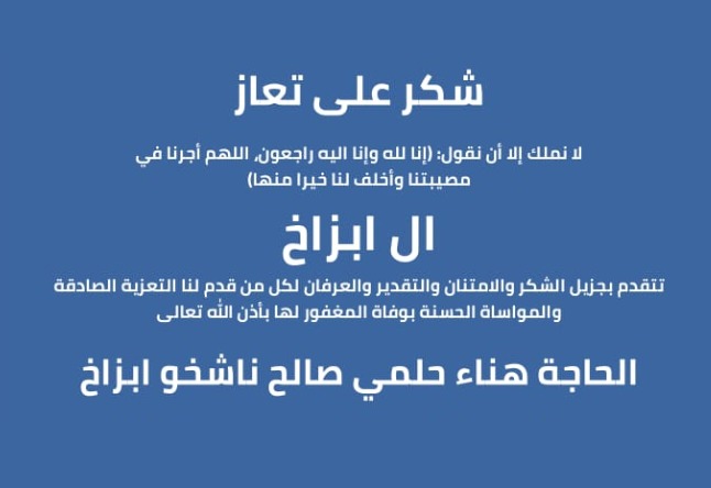 عمان - يتقدم آل ابزاخ بجزيل الشكر والأمتنان والتقدير والعرفان لكل من قدم التعزية الصادقة والمواساة الحسنة بوفاة المغفور لها بإذن الله تعالى الحاجة " هناء حلمي صالح ناشخو ابزاخ " , زوجة العميد الطيار المتقاعد عمر حسن ابزاخ .