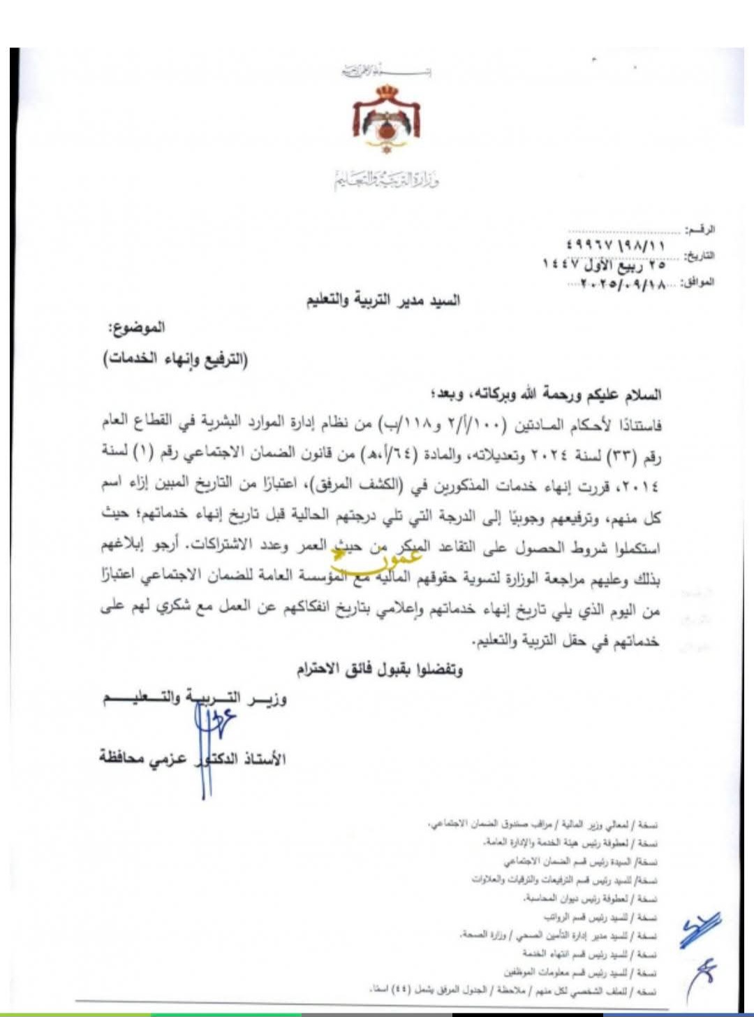 بعكس ذلك ستكون الاستفادة محدودة في حال استمر الموظف في عمله لمدد أقل بعد ترفيعه. أما إذا تم الترفيع كما في كتاب وزير التربية "المرفق" حيث قرّر ترفيع (44) موظفاً اعتباراً من 30-9-2025 وإنهاء خدماتهم بإحالتهم على التقاعد المبكر بنفس التاريخ فلن يستفيد الموظف فلساً واحداً في راتبه التقاعدي كنتيجة لهذا الترفيع.