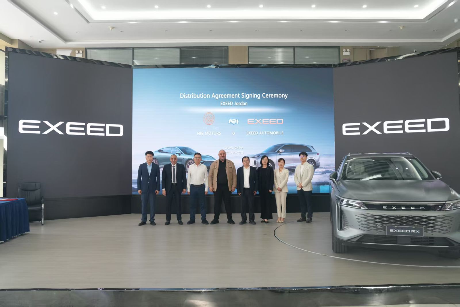 وكانت مراسم توقيع اتفاقية الشراكة قد أقيمت في مقر شركة EXEED بمدينة ووهُو، الصين في الثاني عشر من شهر حزيران الماضي، وذلك بحضور وفد من جانب شركة FBB Holdings ، ضم رئيس مجلس إدارتها، فايز بوشناف، ونائب الرئيس والرئيس التنفيذي لديها، فتحي علام، فيما حضره من جانب شركةExeed Automobile ، رئيس شركة Chery International، غوبي زانغ، ونائب رئيس شركة EXEED International، تشين، والمدير العام لـ EXEED – الشرق الأوسط، ميساء، وعدد من كبار المسؤولين التنفيذيين في الشركة.