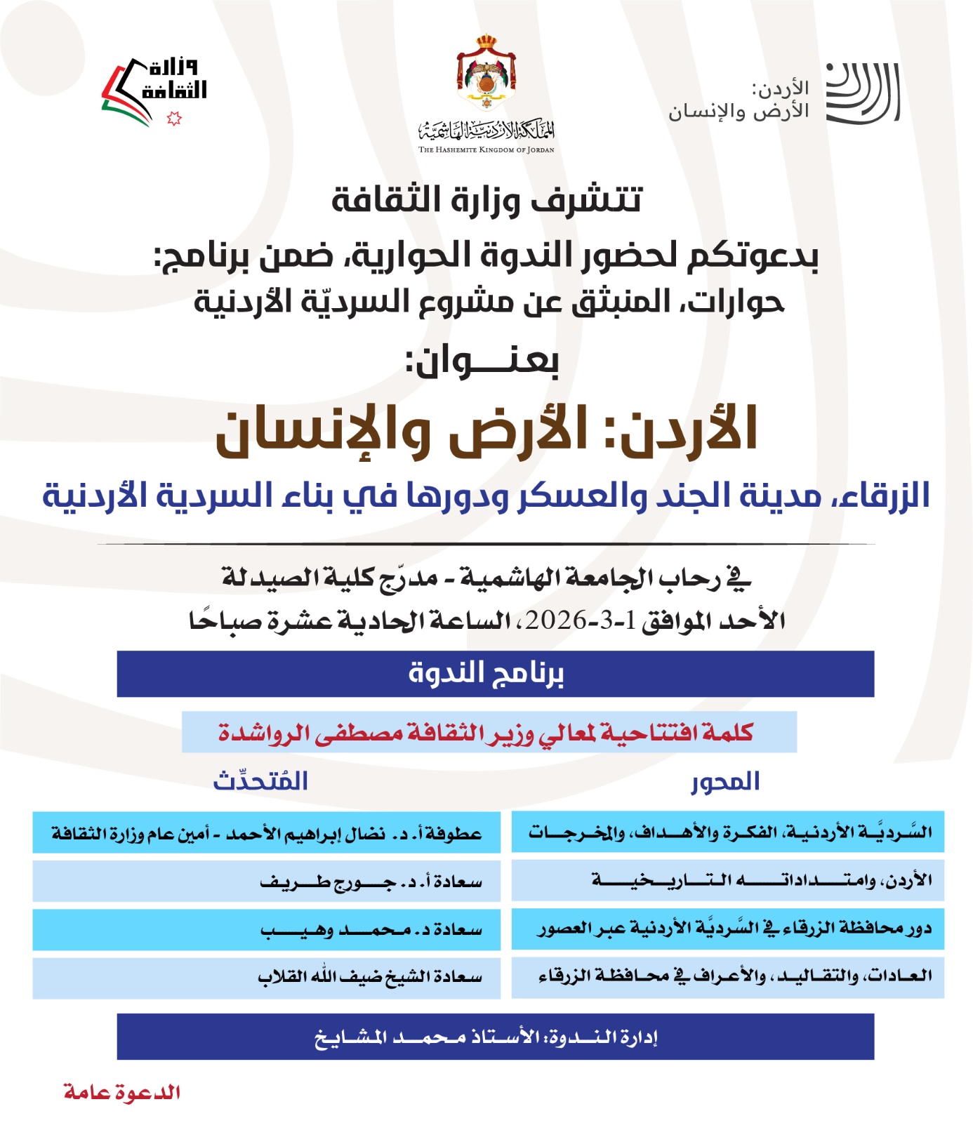 ويتحدث في الندوة وزير الثقافة مصطفى الرواشدة وأمين عام وزارة الثقافة الدكتور نضال الأحمد والدكتور جورج طريف والدكتور محمد وهيب والشيخ ضيف الله القلاب ويدير الندوة الكاتب محمد المشايخ وسط دعوة مفتوحة للمهتمين والباحثين لحضور فعالياتها والمشاركة في حواراتها.