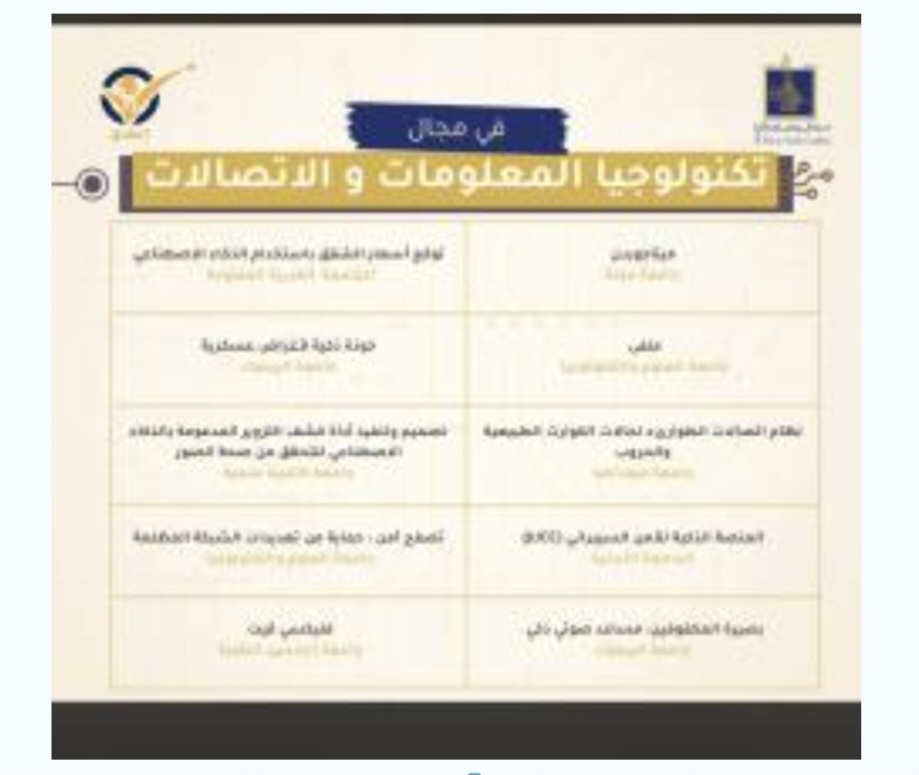 وفي فئة تكنولوجيا المعلومات والاتصالات، تأهل مشروع "نظام اتصالات الطوارئ لحالات الكوارث الطبيعية والحروب"، والذي يهدف إلى توفير قنوات اتصال موثوقة خلال الأزمات لضمان سرعة الاستجابة وعمليات الإنقاذ.